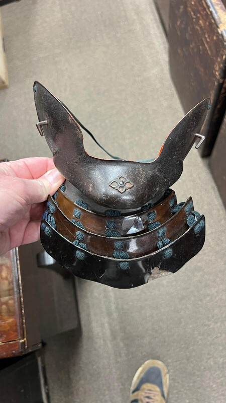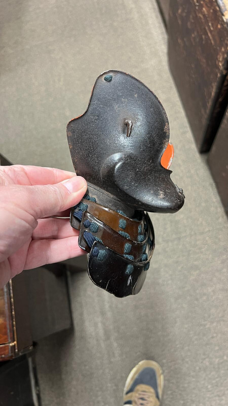 Hello everybody, I am offering this nice tetsu sabiji hanpo / hanbo for sale. It dates from the end of the Edo period. It is a rather large one compared with the most common types. Fitted with odayori ore kugi (bent anchoring post) plus ase nagashi no ana (sweat drainage hole). The mask is in very good condition. There is some flaking on the lacquer of the tare (throat guard), exactly on the lower most tare lame and on the top lame of the neck guard. This hanpo was bought in Japan. Up for sale 650 Euros plus shipping. PM me if interested. Sorry, no sending to the United States due to the current restriction. Thank you for your interest.