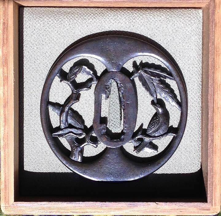 My Tsuba looks very similar to yours, but mine is an alloy like copper or something like that and yours looks like iron. What book is your Tsuba pictured in? I thought I saw my Tsuba in a book, but maybe it was your Tsuba in a book? I showed my Tsuba to Robert Haynes and he said he thought it was Northern Shoami... It came to me via Goran Glucina, who told me it was once in the collection of his Shotokan Karate instructor, Abe Shien. The first image is the truest representation of the color of the Tsuba, as it was taken in sunlight. Dealers at the San Francisco Token Kai told me to take it in the sunlight and I could see the truest representation of the color, and they weren't wrong.