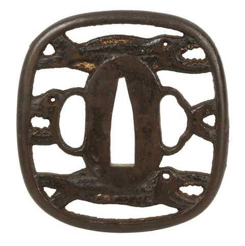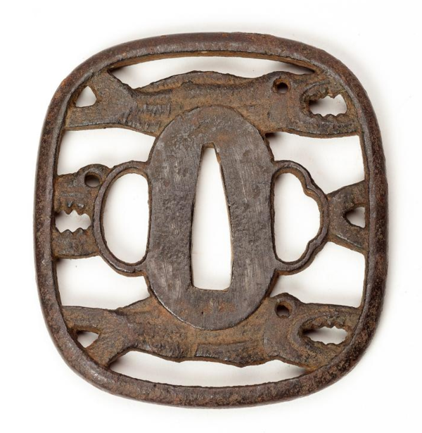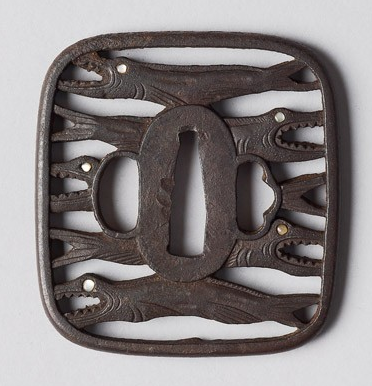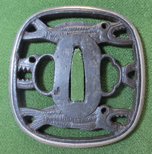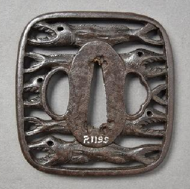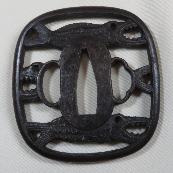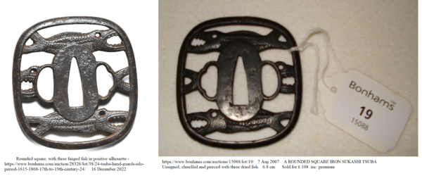 Past auctions with the same tsuba design. https://www.bonhams....-to-19th-century-24/ https://www.bonhams....ctions/15088/lot/19/ https://www.bonhams....uctions/14885/lot/2/ [No image available] A ROUNDED SQUARE IRON SUKASHI TSUBA UNSIGNED, EDO PERIOD Chiselled and pierced with three dried fish 6.8 cm. 4 Apr 2007 Sold for between £ 80 - 120 https://www.invaluab...73fd5232fad4616b3c68 Sold: Galerie Zacke April 01, 2017 Vienna, Austria https://www.invaluab...73fd5232fad4616b3c68 Sold: Galerie Zacke March 22, 2019 Vienna, Austria https://www.invaluab...ccb1affc43c8287e9cfe Unusual 'maru' version described as Akao. https://www.invaluab...ccb1affc43c8287e9cfe described as "toothy fish"3 points