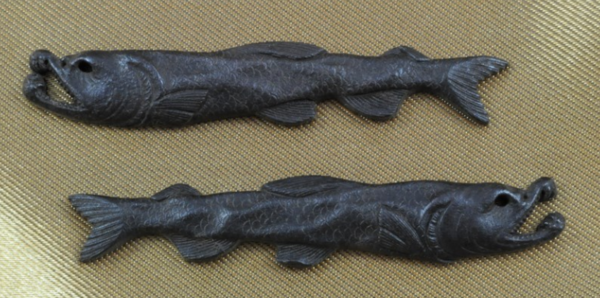 Hi Brad, welcome to the world of tsuba! This design is reasonably common and I suspect there are both traditionally carved and cast examples getting about in various condition. One here with a bronze/brass fukurin added, but from the large casting bubble on the seppa-dai I would say it too is cast and reworked. https://www.jauce.com/auction/c812486163 or https://buyee.jp/ite...o/auction/c812486163 https://drouot.com/e...-sukashi-en-fer-peri [ended] https://www.ebay.com/itm/285322839100 [ended] Royal Ontario Museum [ROM] https://collections....of-four-dried-salmon it is unfortunate that the museum can't count, there are in fact five fish just like the one in the Ashmolean. And the one you found from the Ashmolean Museum with inlaid eyes - With the few extra fish thrown in! Five examples to get you started, I am sure others will be added. https://nihontofranc...lmon-menuki/?lang=en Menuki pair of dried salmon PS. I will send the ROM a note to let them know the number of fish!4 points