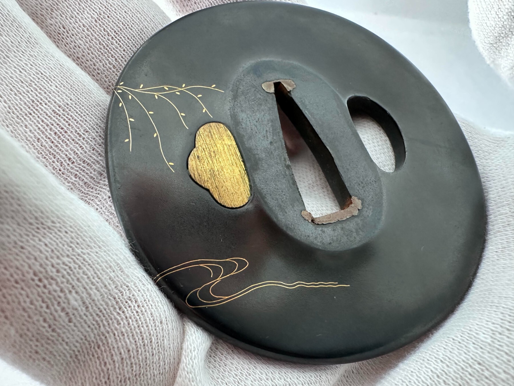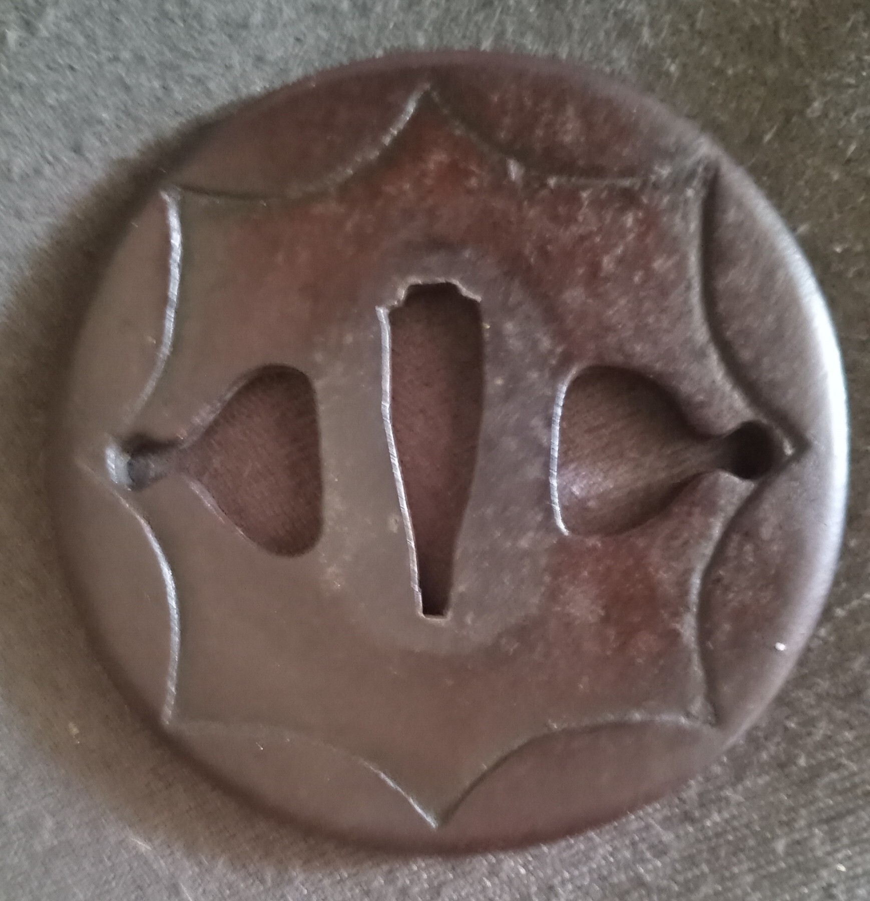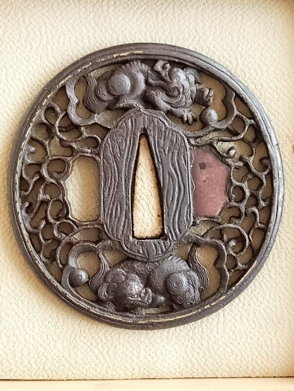 Hello everyone, I recently acquired a small iron mokkō-gata tsuba and noticed an unusual feature: the kozuka-hitsu-ana on the omote side is not the typical oval opening but appears unusually open and almost merges with the outline of the guard. Some details: iron mokkō-gata tsuba motif appears to show a bird with autumn vegetation (possibly maple leaves and berries) traces of gold inlay remain dimensions approx. 57 × 44 mm thickness approx. 2.5 mm weight approx. 41 g My main question concerns the large, open kozuka-hitsu-ana. It seems much more open than what I usually see and visually becomes part of the design rather than a clearly separated aperture. I would be very interested in your thoughts: Is this type of very open or integrated kozuka-hitsu-ana known on certain tsuba? Could this indicate a specific school or regional tradition (for example Mito, Nara, or a provincial Shoami workshop)? Is there any functional explanation, perhaps related to a particular mounting style (e.g. horizontal carrying of a tantō)? Are there documented examples in the literature (e.g. Haynes Index, Wakayama, or Token Bijutsu) showing similar pieces? Many thanks for any insight or comparable examples!3 points