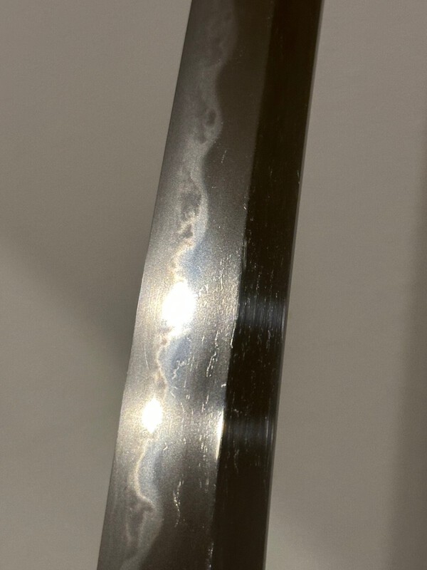 Thanks, Steve. When trying to ID a blade, and weed out fakes, there are a few things we can look at. 1. Do the machi line up? Chinese fakes often have offset machi, like NCO Type 95s, that don't line up. Yours line up. However, some fakes get that right, so it clears the offset machi test, but still not sure. 2. The bohi - Fakes often get the bohi wrong, starting too far down the blade and ending poorly. Yours starts prior to the blade and ends with a clear shape. That's good. 3. Kissaki (blade tip) - Chinese like an anglular tip, Japanese nicely rounded. Yours is rounded, however like the machi line we have seen rounded tips on fakes. So, good, but not definitive 4. Hamon (temper line) - Though hard to see, yours seems to have one. Others might disagree, don't know for sure. 5. Nakago - Shape, yasurime (file marks), shinogi line (ridge that runs along both sides, full length of the blade and through the nakago), mei - Japanese nakago have distinct features. Fakes usually get all of these wrong. Yours has no yasurime and the shinogi is weak. The mei looks poorly struck. Overall - My first thought was that this was a zoheito (a particular style of factory blade made of one piece steel). But they usually are not signed (except by one smith), and the end of the bohi usually has a different shape. However I do have a zoheito on file with a non-standard bohi ending. What I think we have is a late-war blade, possibly a late war zoheito. Sesko lists one wartime Norimitsu and we are aware that there were many unregistered smiths operating during the war. I don't think this was the Nobumitsu listed in Sesko, as he was an RJT qualified smith, but it could have been one of the smiths we see that popped up at the end of the war. All that being said, it could be something made in occupied lands, and it could be a fake. But with the fittings and the points I see, I think the odds are in line with late-war work. Just an opinion.1 point