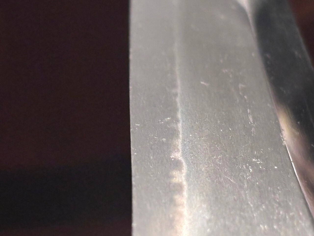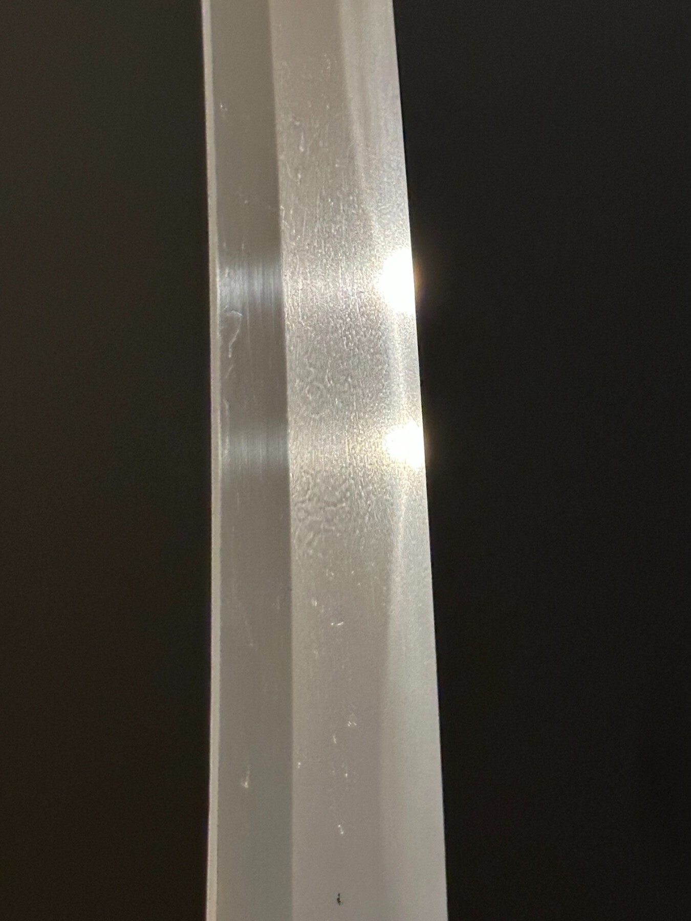 Not meaning to muddy the waters here... But there is nashiji hada aka "pear skin" and several other forms of densely forged hada. As well as mu-hada "no hada". All three can appear very frequently in Shinshinto blades. This one might be a good candidate for Shinsa, just to get an expert opinion on the hada alone!2 points
