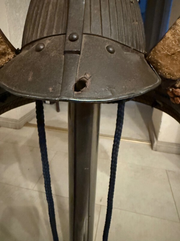 Hello, I share with you an interesting and rare old Hoate (or Hanbô) from the muromachi period (15-16 th). A half-mask made of natural iron, of the "Hanbō" type, covering half the face and excluding the nose. The inner surface is lacquered red. A sweat vent and a channel (ase nagashi) are present on the lower part. Two stamped iron "yadome" straps on each side of the mask guide and protect the helmet cord, while two iron studs (otayori) on the lower part secure the cord. The four-row gorget (yodarekake), very likely contemporary with the mask, is made of superficial iron strips covered with lacquered leather, joined together in a "hon kozane" style and then in a "kebiki odoshi" style with printed suede "egawa" cords and red silk. This half-mask is designed to cover part of the face while also protecting the cord and ensuring the helmet (still quite heavy during the Muromachi period) stays in place and distributing its weight more evenly. Half-masks from this period are extremely rare. The mask's shape, with its iron gorget covered in lacquered leather, immediately suggests a very early date, further confirmed by the black corrosion of the iron, which allows us to date the object to the middle of the Muromachi period (1336-1573). Some examples of hoate wearing during the Muromachi period : Handscroll : A Long Tale for an Autumn Night (Aki no yo nagamonogatari) ca. 1400. Metropolitan Museum of Art New-York, 2002.459.2 https://www.metmuseum.org/art/collection/search/65122 others exemple :1 point