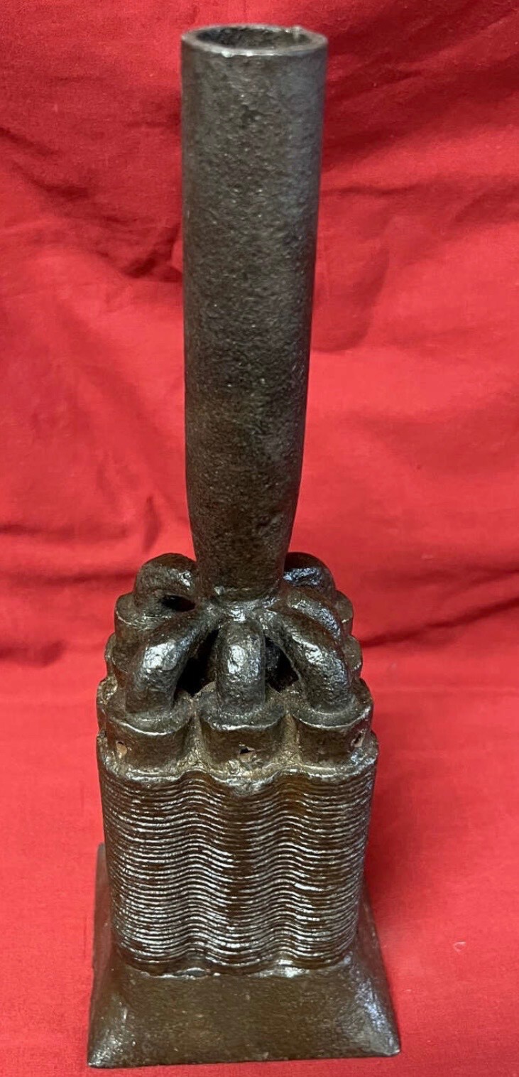 First off … is this OK to be discussed here? I did see another similar post recently … but I want the Mods to confirm or … I have 2 of these, one ‘square’ like this and the other is a fully round body. Info seems to be dearth on these, but I foind this online -see below - from the IMA (International Military Arms) site. Bit keep these questions in mind, thanks! -Do you concur? -Anything to add or debate/question? -What do YOU think the value is? Now this is an incredible piece of early Ming Dynasty history, circa middle 14th Century. This is the first one of these 8-Shot Hand Cannons we have received and we couldn’t have gotten a better example! The hand cannon, also known as the gonne or handgonne, is the first true firearm and the successor of the fire lance. It is the oldest type of small arms as well as the most mechanically simple form of metal barrel firearms. Unlike matchlock firearms it requires direct manual external ignition through a touch hole without any form of firing mechanism. It may also be considered a forerunner of the handgun. The hand cannon was widely used in China from the 13th century onward and later throughout Eurasia in the 14th century. In 15th century Europe, the hand cannon evolved to become the matchlock arquebus, which became the first firearm to have a trigger. This example was meant to be mounted on a pole, much like the earlier fire lance. This hand cannon has a 4 ½” inch socket which would fit a 1” wide wooden shaft. The center hole on the muzzle area of the cannon is much smaller than the other 8 and is not meant to be fired from. This center hole was meant as a means to keep the spear length shaft secured. All 8 “chambers” have their own individual touch hole just like a regular cannon, making this an early semi-automatic of sorts! Each barrel is mostly clear with a clear touch hole, all inspected with a borescope, though there is buildup from corrosion on the insides. Each of the barrels measures approximately 3 ½” in length. An incredible example of an extremely rare hand cannon dating back to the early days of the Ming Dynasty! Comes more than ready for further research and display. Specifications: Year of Manufacture:14th Century Caliber:about 0.34 inches Ammunition Type:Lead Ball and Powder Ignition: Touch Hole BarrelLength:3 1/2 inches Overall Length:9 5/8 inches Feed System: Muzzle Loading – 8 Barrels The earliest artistic depiction of what might be a hand cannon — a rock sculpture found among the Dazu Rock Carvings — is dated to 1128, much earlier than any recorded or precisely dated archaeological samples, so it is possible that the concept of a cannon-like firearm has existed since the 12th century. This has been challenged by others such as Liu Xu, Cheng Dong, and Benjamin Avichai Katz Sinvany. According to Liu, the weight of the cannon would have been too much for one person to hold, especially with just one arm, and points out that fire lances were being used a decade later at the Siege of De’an. Cheng Dong believes that the figure depicted is actually a wind spirit letting air out of a bag rather than a cannon emitting a blast. Stephen Haw also considered the possibility that the item in question was a bag of air but concludes that it is a cannon because it was grouped with other weapon-wielding sculptures. Sinvany concurred with the wind bag interpretation and that the cannonball indentation was added later on. The first cannons were likely an evolution of the fire lance. In 1259 a type of “fire-emitting lance” (tūhuǒqiãng 突火槍) made an appearance. According to the History of Song: “It is made from a large bamboo tube, and inside is stuffed a pellet wad (zǐkē 子窠). Once the fire goes off it completely spews the rear pellet wad forth, and the sound is like a bomb that can be heard for five hundred or more paces.” The pellet wad mentioned is possibly the first true bullet in recorded history depending on how bullet is defined, as it did occlude the barrel, unlike previous co-viatives (non-occluding shrapnel) used in the fire lance. Fire lances transformed from the “bamboo- (or wood- or paper-) barreled firearm to the metal-barreled firearm” to better withstand the explosive pressure of gunpowder. From there it branched off into several different gunpowder weapons known as “eruptors” in the late 12th and early 13th centuries, with different functions such as the “filling-the-sky erupting tube” which spewed out poisonous gas and porcelain shards, the “hole-boring flying sand magic mist tube” (zuànxuéfēishāshénwùtǒng 鑽穴飛砂神霧筒) which spewed forth sand and poisonous chemicals into orifices, and the more conventional “phalanx-charging fire gourd” which shot out lead pellets. Hand cannons first saw widespread usage in China sometime during the 13th century and spread from there to the rest of the world. In 1287 Yuan Jurchen troops deployed hand cannons in putting down a rebellion by the Mongol prince Nayan. The History of Yuan reports that the cannons of Li Ting’s soldiers “caused great damage” and created “such confusion that the enemy soldiers attacked and killed each other.” The hand cannons were used again in the beginning of 1288. Li Ting’s “gun-soldiers” or chòngzú (銃卒) were able to carry the hand cannons “on their backs”. The passage on the 1288 battle is also the first to coin the name chòng (銃) with the metal radical jīn (金) for metal-barrel firearms. Chòng was used instead of the earlier and more ambiguous term huǒtǒng (fire tube; 火筒), which may refer to the tubes of fire lances, proto-cannons, or signal flares. Hand cannons may have also been used in the Mongol invasions of Japan. Japanese s of the invasions talk of iron and bamboo pào causing “light and fire” and emitting 2–3,000 iron bullets. The Nihon Kokujokushi, written around 1300, mentions huǒtǒng (fire tubes) at the Battle of Tsushima in