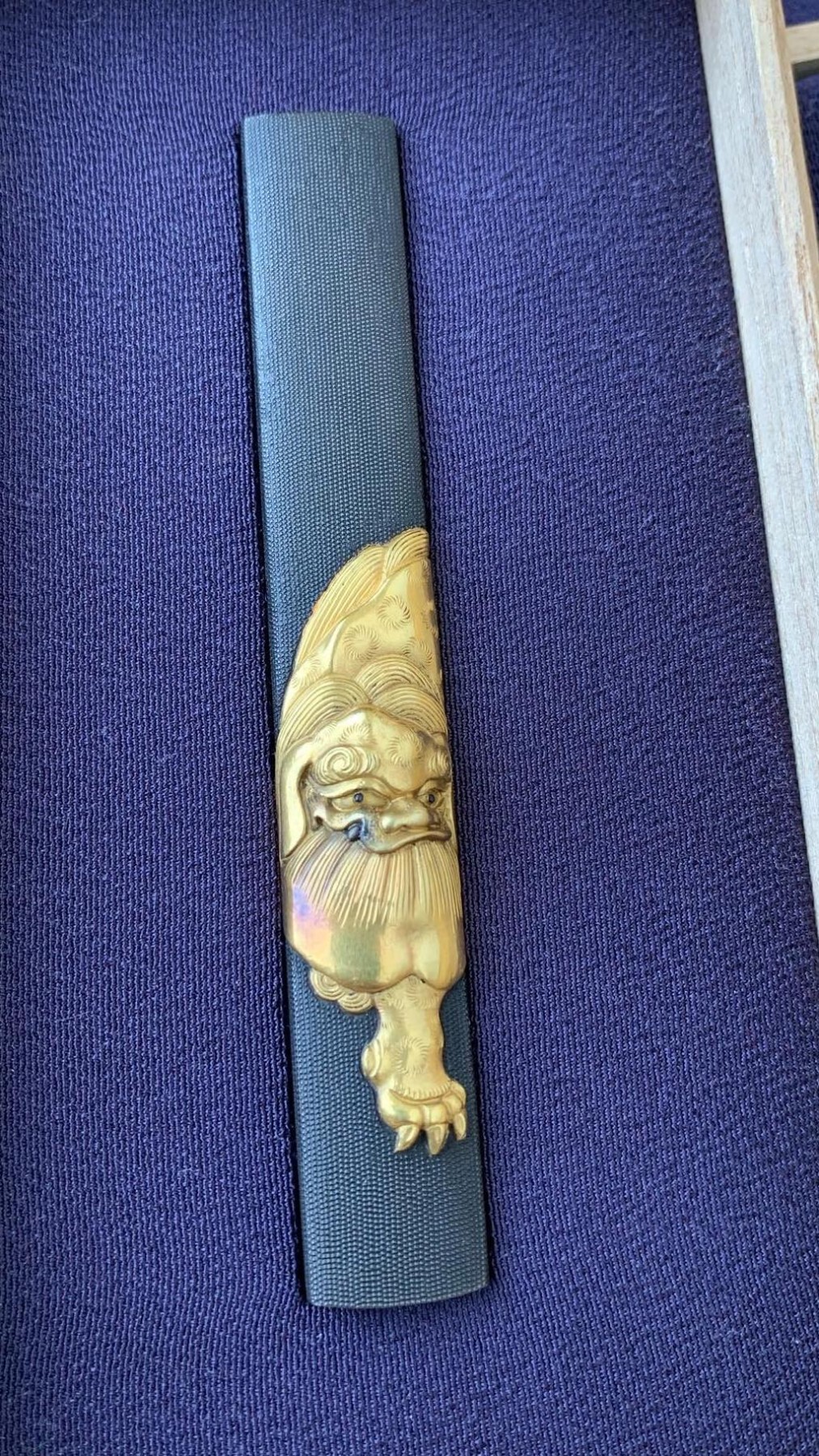 WAKIZASHI AWATAGUCHI FUJIFUSA / KOSHIRAE MEI: AWATAGUCHI FUJIFUSA DATE: 0 c. 1532 MUROMACHI NAGASA: 17.3125" OVERALL: 21.625" MIHABA: 1.01" KASANE: 0.25" SORI: 0.40" NAKAGO: UBU MEKUGI ANA: ONE YASURIME: SUJIKAI MUNE: IORI HADA: KO-ITAME HAMON: GUNOME CHOJI BOSHI: KOMARU HORIMONO OMOTE: NONE HORIMONO URA: NONE HABAKI: 1 PC. COPPER KOSHIRAE Wakizashi in koshirae signed Awataguchi Fujifusa. I could only find one reference for what may be this smith. Hawley’s lists one Fujifusa, a Muromachi smith c. 1532. It could be this smith, the other two options are gimei or an unlisted smith, (see reference and disclaimer below). Nakago is ubu with two mekugi ana. The hada is ko-itame and the hamon is gunome choji. Boshi is ko-maru. The sword is in fair condition but does have numerous small, non-fatal issues such as, surface pitting, kitte-ware, light rust, tarnish and hike-kizu or surface scratches. Comes with a one piece copper habaki. See photos for more detail. Koshirae has some nice fittings. The F/K are shakudo nanako with sparrows and bamboo in gold and copper. The menuki are a floral design of flowers and leaves in shakudo and gold. Saya is a rusty brown with horn koigughi and kurkata. Tsuba is iron with a carved pine with gold highlights. REFERENCES: Hawley’s (FUJ 6), pg. 31 15pt. c.1532 Condition: See Photos. The information I have provided is all I have on this item. Returns: Not accepted unless item is not as described. Ships USPS Priority Mail Insured. Your address and contact information is required to get an accurate shipping quote. Buyer is responsible for knowing your countries import laws and regulations. LIMITED TIME SALE: As with all “sales” sale is final. WAS: $975 plus any additional fees (S/H, PayPal, Wire, Insurance, etc) NOW: $800 plus any additional fees (S/H, PayPal, Wire, Insurance, etc) *Contact me via email only: Yakiba.com@gmail.com *Disclaimer: Information provided on items offered without kanteisho (papers) or with old shinteisho (papers) is nothing more than an opinion or translation of what is inscribed on the item as is along with any pertinent information of the smith referred to! This opinion/translation and information is provided as a courtesy only and is not an indication, opinion, or guarantee that the item is shoshin. Old shinteisho (white, green, blue, etc.) are no longer recognized by the NBTHK and if re-submitted to shinsa may or may not receive the same attribution. Items which are not accompanied by kanteisho (papers) have a higher probability of being gimei, but that is not always the case. Please do your own research, ask questions prior to committing to purchase and commit only when you are ready to purchase. Please, do not commit to purchase, then attempt to negotiate a lower price.1 point