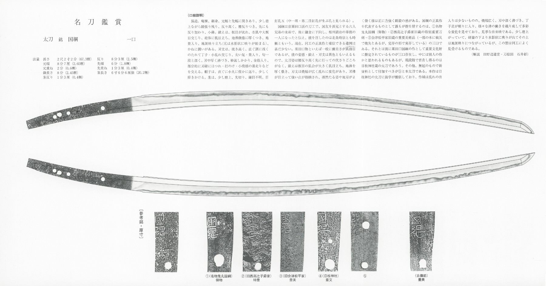 Here we have an outstanding example of how many years of excessive wiping can lead to a rather dull looking blade... This is the Kikko Sadamune - Sadamune's most brilliant work photographed in 1948. You would not tell this is his most beautiful sword. And here we have a photo in 1967 after it has been beautifully polished - boy does a polish make a difference - it is like a completely difference sword. Bright and clear. Not dull and boring. The Kikko Sadamune is the Sadamune sword that is most praised for it's beauty. Ironically, this is a very a-typical Sadamune sword as it moves away from his more typical Mokume-hada and adopts Gō Yoshihiro's "modern style". Like a typical Gō blade it has a shinogi-zukuri, iori-mune and well forged itame grain with, with thick ji-nie and well-defined ji-kei (patterns in the ji). The hamon (temper line) is a shallow large notare mixed with small gunome (irregular wave-like patterns), with small ashi (short lines extending from the base), generally well-defined nie with occasional coarse nie, frequent kinsuji (golden lines), and sunagashi (sand-like patterns). I hesitate to say this but if the Kikko Sadamune was not Meibutso and papered by Hon'Ami in the past as a Sadamune - if it appeared on the market today as a mumei blade I suspect it would be designated a Tokubetsu Juyo by Gō as it has almost all of the trademarks. Regardless, it is an exquisite blade and shows the power of a polish.4 points