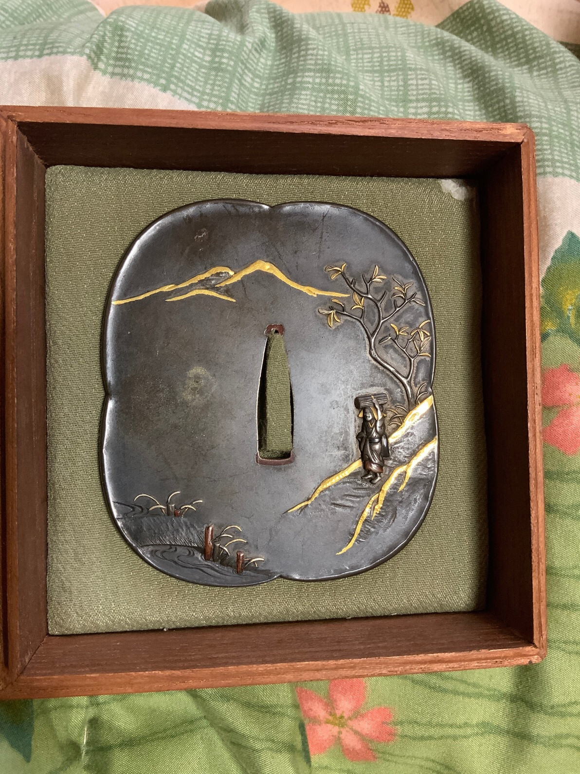 I have added in a picture of it for reference. Thank you for the interest and replies. The shadow is a little deceiving to make it look a little more squatish when is reality it's more rectangular with square corners. I am reasonably sure it's authentic. My teacher got it for me at an antique shop on his last trip to Japan to train. This antique dealer was recommended by his sensei who seems to be knowledgeable of such things. Jt1 point