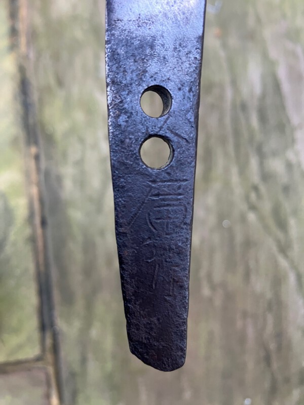 Hello from the UK I love any Japanese Art the dwells on legends, bakemono, yokai etc and this Tsuba depicts “The slaying of the Nue”. From the Heike Monogatari, the Nue was a monstrous Yokai with the body of a tiger, the head of a monkey and a snake for a tail. This scene depicts the Samurai Minamoto no Yorimasa and his servant Ino Hayata about to slay the beast at the request of the rather unwell and troubled Emperor Konoe. The beast was hit by Yorimasa’s arrow (you can just see him drawing his bow) as it emerged from its swirling black cloud, it fell from the sky and was finished off by the servant. As a reward, Yorimasa was presented with the sword “Shishio” as the health of the Emperor instantly improved. The patina is an even very dark brown/black Anything you can tell me about the tsuba or the double sided mei would be greatly appreciated…age, school?? Etc H7.6cm W7.3cm Thickness 5.1mm many thanks. Colin1 point