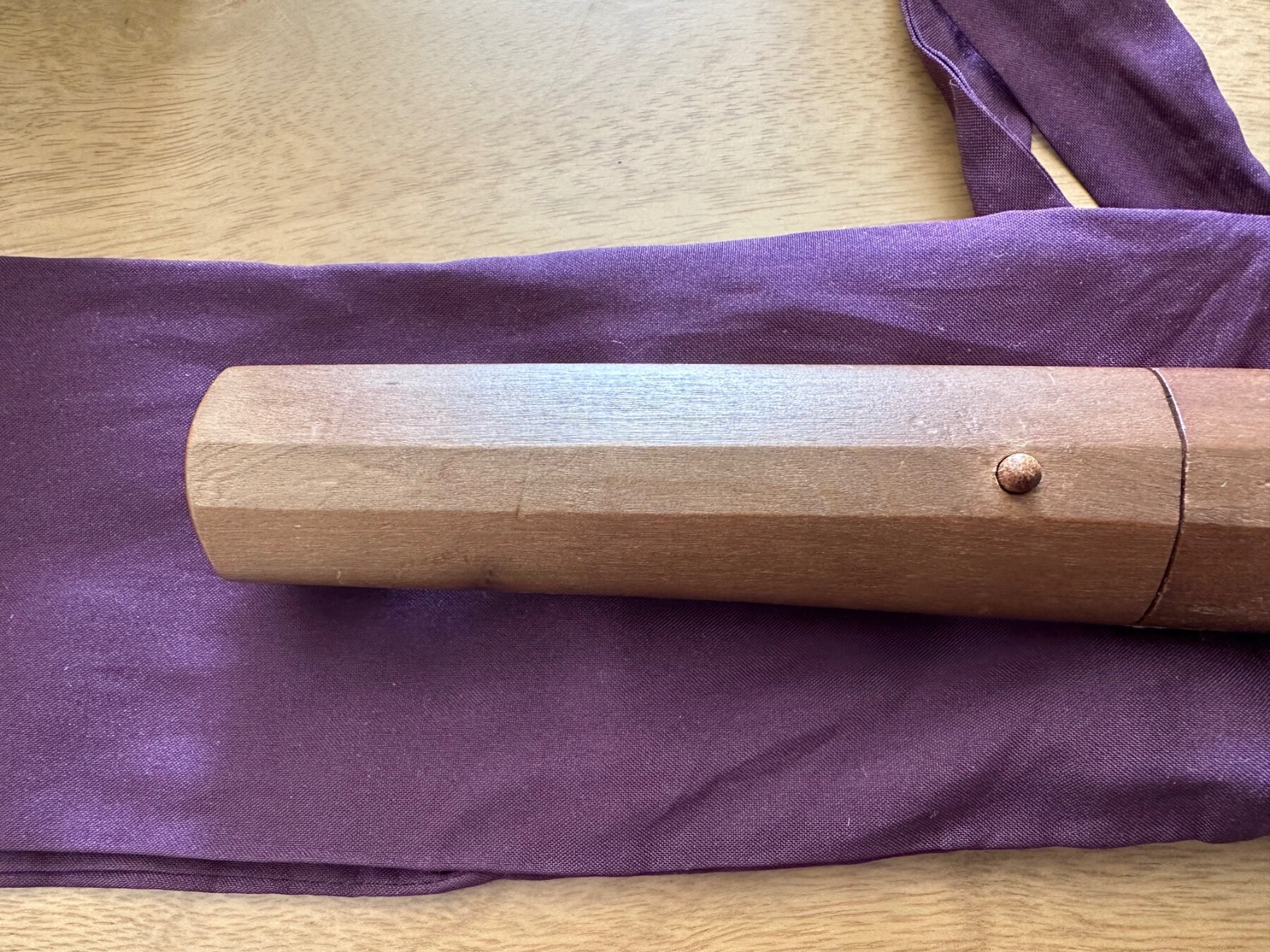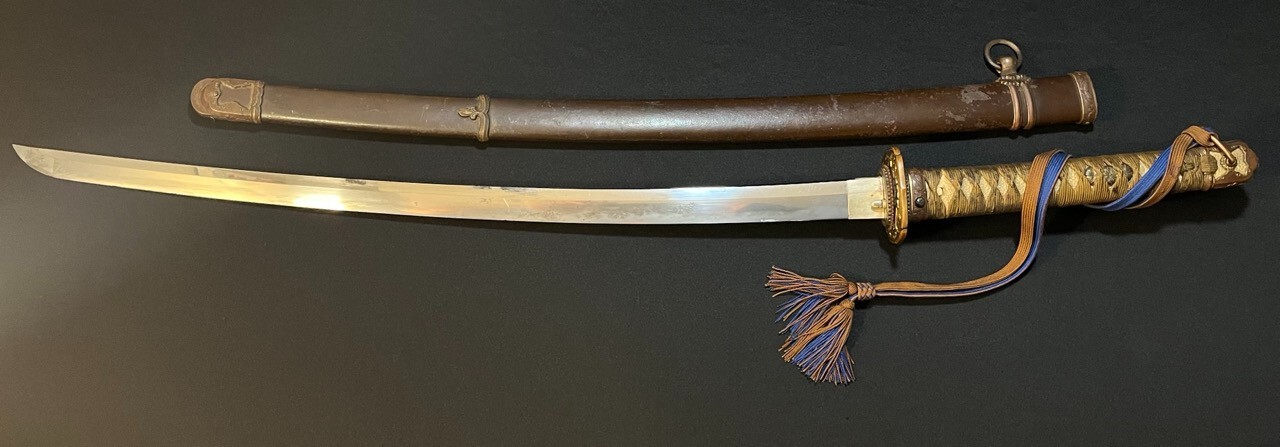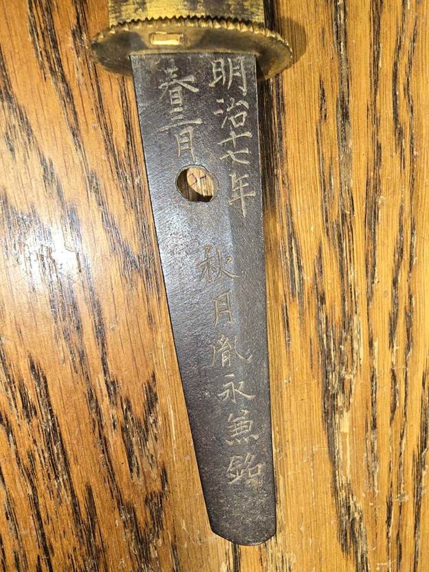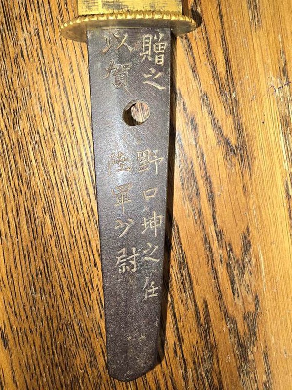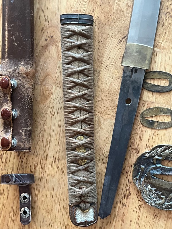 My observation is that you are not wearing socks. Otherwise we can see your apartment, but no photos of the blade or the NAKAGO (= tang) of it. It could be a civilian sword, not a military one, but that can only be determined with better photos. More comment is difficult at this time. When making new photos, please use a plain dark background, a dark room and spotlights. There is a bamboo peg up in the handle which could be pushed out from the smaller side. Then the blade will come loose. Please DO NOT TOUCH THE BLADE WITH YOUR BARE FINGERS as the high-carbon steel can corrode easily! The blade might also be sharp, so be very careful! Use a clean cotton rag if the blade has to be held. In case you are not used to handling genuine Japanese swords, please ask all questions you might have.2 points