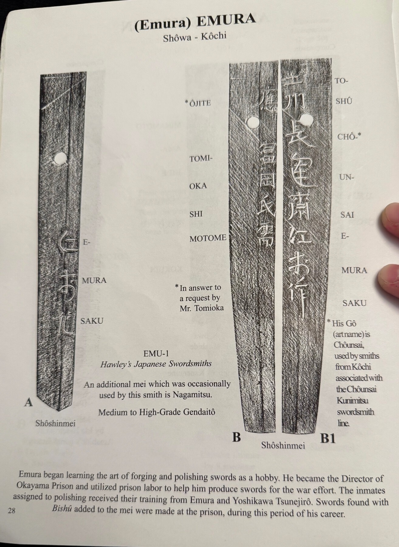 One of our NBTHK members is a Bizen potter and after much effort he eventually succeeded in making a full-sized version in fired clay. Another member creates detailed exact-scale copies in wood, down to the nick in the blade edge. These are not cheap but there is a waiting list for his work, the Sanchōmō and other famous blades. Even the Mei are faithfully chiselled in.1 point
