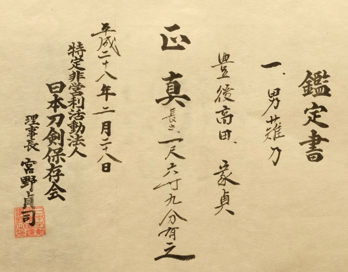 The Samurai Museum Berlin owns a katana attributed to Kinju, on whose tang the katakana “Kusarinawa” is inscribed in silver. This is likely a synonym indicating that the blade cuts with ease, as if through a rotting straw rope.1 point