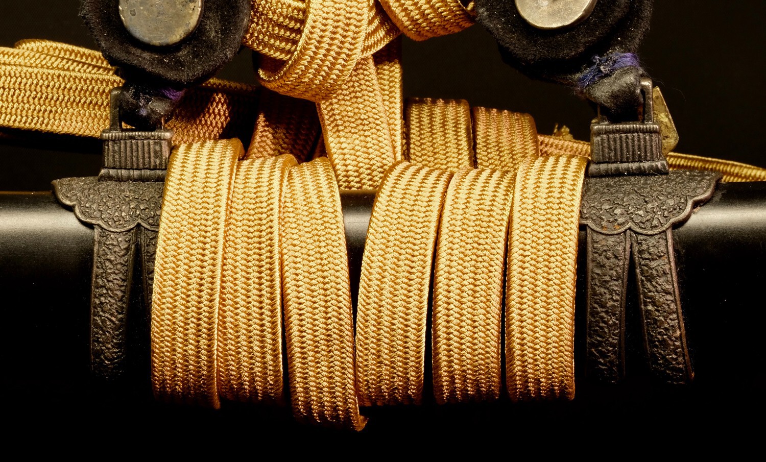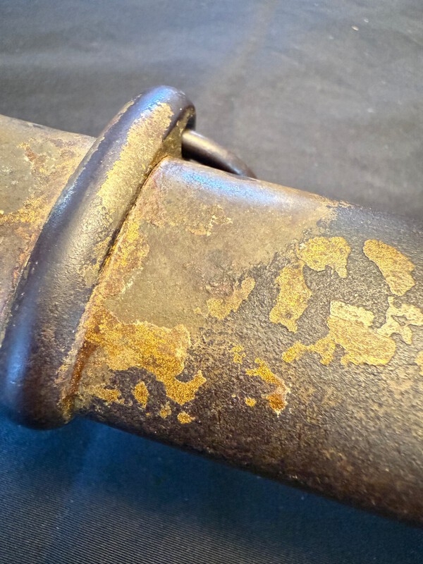 I've been hijacking @Shamsy's Type 95 Black Saya thread for too long, so I'm starting a Gold-painted gunto thread to track the gold ones. I considered labeling it "Painted Gunto" to gather all the colors, but the discussions of each can get quite lengthy, so I'll keep this one just on the gold. But for reference, Steve's thread also has several examples of officer gunto painted black as well. And we have the thread on Mottled Green paint on Type 95s. I've had examples of all 3 colors and regret stripping the 2 gold-painted 95s and the mottled-green 95. I still have one black-painted 95. But back to the gold! My interest started with the acquisition of 2 Type 95s, one totally painted gold (even the blade) and a late-war 95 painted black and gold: I believe this one might have been post war as the paint come off relatively easy using acetone, and the blade, once cleaned, had lots of scratches and marks as if used plenty prior to painting. Also, there was no original paint underneath. It had been completely stripped before re-painting with gold. The late war 95: In hindsight, I now believe this one to be a wartime personalization. The paint was hard to get off with acetone, and the original color was underneath. The following are other examples that I've filed, beginning with a primo one just posted by @Arty A on this thread HERE. The paint is old and abused from use, and is covered with patina inline with the rest of the gunto: (out of time for now. Will update and continue later)1 point