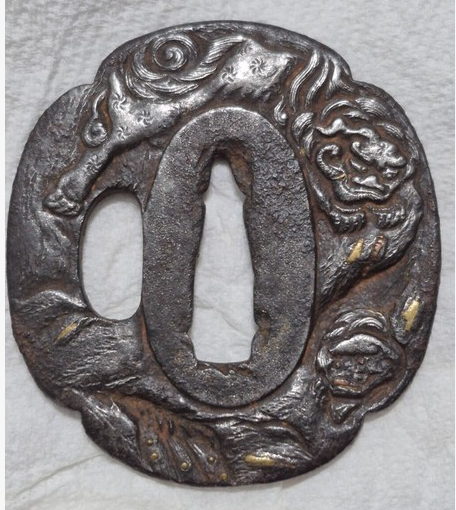 It could be posted over on the Lion/Shishi thread https://www.militaria.co.za/nmb/topic/55087-post-your-lionshishi/page/2/#comment-575961 It might get someone who specialises in this theme. Looks ubu to me, but very worn. Obviously not as fine as this: https://www.bonhams.com/auction/19295/lot/42/an-iron-tsuba-by-myochin-munefusa-19th-century/1 point