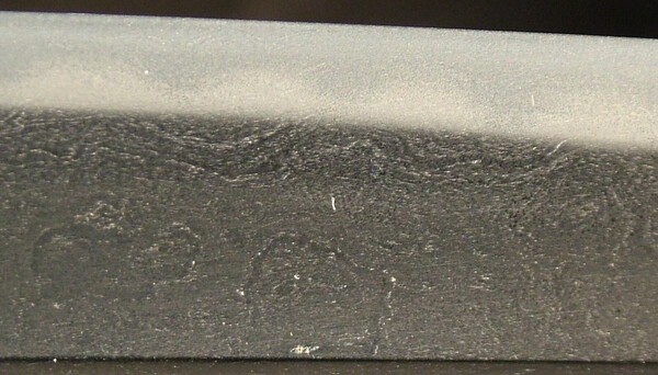 indeed interesting smith, from Book Markus Sesko: SUKETAKA (助隆), Kansei (寛政, 1789-1801), Settsu – “Ozaki Gengo´emon Suketaka” (尾崎源五右衛門助隆), “Ozaki Gengo´emon no Jō Suketaka” (尾崎源五右衛門尉助隆), “Ozaki Gengo´emon Fujiwara Suketaka” (尾崎源五右衛門藤原助隆), “Ozaki Nagato no Kami Fujiwara Ason Suketaka” (尾崎長門守藤原朝臣助隆), real name Ozaki Gengo´emon (尾崎源五右衛門), he was born in the third year of Hōreki (宝暦, 1753) in Harima province but moved later to Ōsaka to study under Kuroda Takanobu (黒田鷹諶), Takanobu in turn was the grandson of the 6th gen. Bungo Kai-Mihara Masaie (貝三原正家), Suketaka received the honorary title Nagato no Kami (長門守) in the twelfth month of Kansei ten (寛政, 1798), he died in the second year of Bunka (文化, 1805) at the age of 53, as Suishinshi Masahide he too tried to copy the tōran-midare of Sukehiro (助広), that means we can see how early shinshintō smiths were influenced by Kamada Natae´s (鎌田魚妙) praise of Sukehiro´s tōran in his standard work Shintō Bengi (新刀弁疑), his successor was his son Takashige (隆繁), Suketaka´s blades have a shallow sori, a thick kasane, much hira- – 1017 –niku, and a relative large chū-kissaki, they show a dense and hardly discernible ko-itame which tends to muji, we know tōran- midare, gunome-midare, and suguha hamon whereas the tōran-midare consists of rough and irregular nie, the tama don´t have an uniform size, he applied a long sugu-yakidashi and the bōshi ist ko-maru, some blades show horimono in the form of dragons, plum blossoms, or a branch of a plum tree, the tip of the tang is an iriyamagata-jiri, the yasurime are ō-sujikai with keshō, he signed also with a characteristical cursive script which tends almost to grass script whereas the date signatures of such mei are entirely executed in grass script, jō-saku1 point