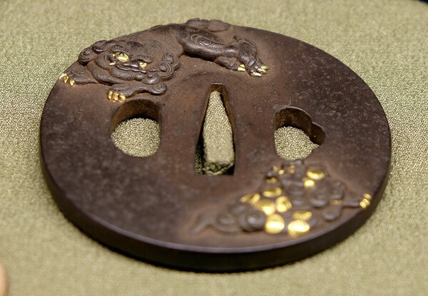 The first shishi tsuba that I have is a Shakudo one signed Masanaga. The tsuba depicts two shishi in shishiaibori and engraved in katakiri on the reverse with a windblown peony. Shishi are mythical guardian lions in both China and Japan and the peony is regarded as the king of flowers and in Japan symbolises bravery, honour and good fortune. The design of shishi and peony is often augmented by the addition of a butterfly. This is because, according to legend, the shish has a weakness in that a bug lives inside it, but if it sleeps under a peony the morning dew is absorbed by the shishi and the bug is eliminated as a larva, which metamorphoses into a butterfly. The tsuba is signed Masanaga, with a kao and was catalogued as Haynes Index no. H 04250, which identifies the artist as Chosuke Masanaga (d. ca 1700), who was a student of Nara Toshinaga (Markus Sesko) or Ito Masatsugu (Haynes). However, there were two generations of Masanaga in the Nara School and both used the same kanji for their signatures. The first generation, Seiroku, was a student of Toshinaga (either the 3rd generation master of the Nara School or a student of the same name). His (adopted?) son was Gihachi Masachika, who signed Masanaga for a while after his father’s death and was from the Kawakatsu family and a nephew of Sugiura Joi. The Nara tsuba artist Gohachi Masachika may have been an alternative name used by either of the other two Masanaga. Consequently, there is some uncertainty as to the identity of the artist who made this tsuba. Height: 7.6 cm. Width: 7.4 cm. Thickness (rim): 0.4 cm. Weight: 216 g Provenance: Edward Wrangham Collection, Part I, 9 November 2010, Lot 37, bought from the Roland Hartman Collection of Japanese Metalwork (Christies, 30 June 1976, Lot 130) The second shishi tsuba is a large copper one made in the 20th century by Yanagawa Morihira (1899-1971) and was made as a work of art, rather than as a practical object to be mounted on a sword. The shape of the tsuba may be best described as sumi-iri-kakagata (lit: notched in square). The front (omote) of the tsuba shows both a shishi and peonies, whereas the reverse (ura) only shows the shishi. Interestingly, the shishi on the omote has a silver body and a golden mane and tail, whereas the combination of silver and gold is reversed on the ura. The faces on both animals are copper. Shishi are often represented as playful creatures, but these two are muscular with a fearsome pose and the silver shishi has a head which looks rather like Hannya, the Japanese female demon. The engraved peonies on the omote are coloured with silver and gold gilding and the petals are in a darker shade of silver. The outlines are defined in katakiribori (half cut carving) and kebori (hair carving) and, particularly the silver, darkened to add extra tonality to the design. The nakago ana has four 32(?)-petalled chrysanthemum punch marks on each side, purely for decoration and the tsuba is signed on the lower right face of the ura Morihira (守平). There is also a single kozuka hitsu ana, filled with a gilt cat scratched plug. Shishi are mythical guardian lions in both China and Japan and it is also the name given to a group of political activists (Ishin Shishi 維新志士) in the late Edo period who opposed the westernisation of Japan. The peony is regarded as the king of flowers and in Japan symbolises bravery, honour and good fortune. I think that it is likely that this tsuba was made in the 1930’s when Japanese militarism was at its peak. I expect that the intention of the artist was to represent the shishi as fearsome creatures prepared to protect Japan in its time of conflict. However, in my view, the artist failed in this respect and they appear rather camp. I purchased this tsuba in memory of my nephew, who died young (52) at about the same time this came up for sale. He was a rather over the top extrovert character and I thought it would be a suitable memorial for him. Height: 8.75 cm. Width: 8.4 cm. Thickness (rim): 0.7 cm; Nakago: 0.4 cm. Weight: 254 g Provenance: Bonhams (Lot 48, 13 May 2021). Best wishes, John1 point