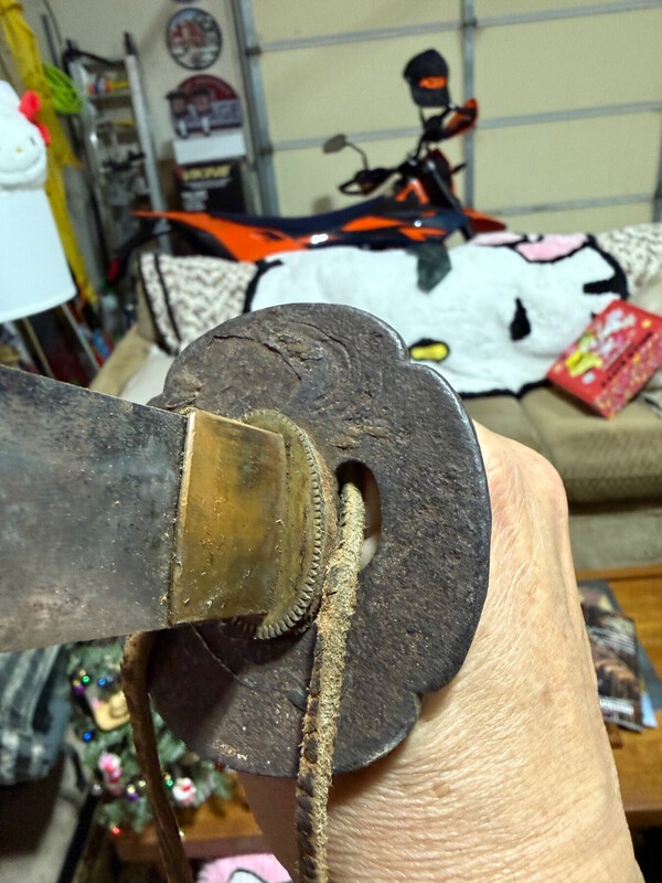 I do not think that the “tsuka maki” was ever intended to slide off the tsuka. The fact that it has survived is a miracle because I think it is simply a continuous thick cord or twine wrap that was originally glued to the tsuka and then stabilised by a coating of thick lacquer. Possibly several coats that have then created a very rigid structure. For some reason the glue has given way and it has slid off. I have owned similar wraps on tanto…..but never had one come off!1 point