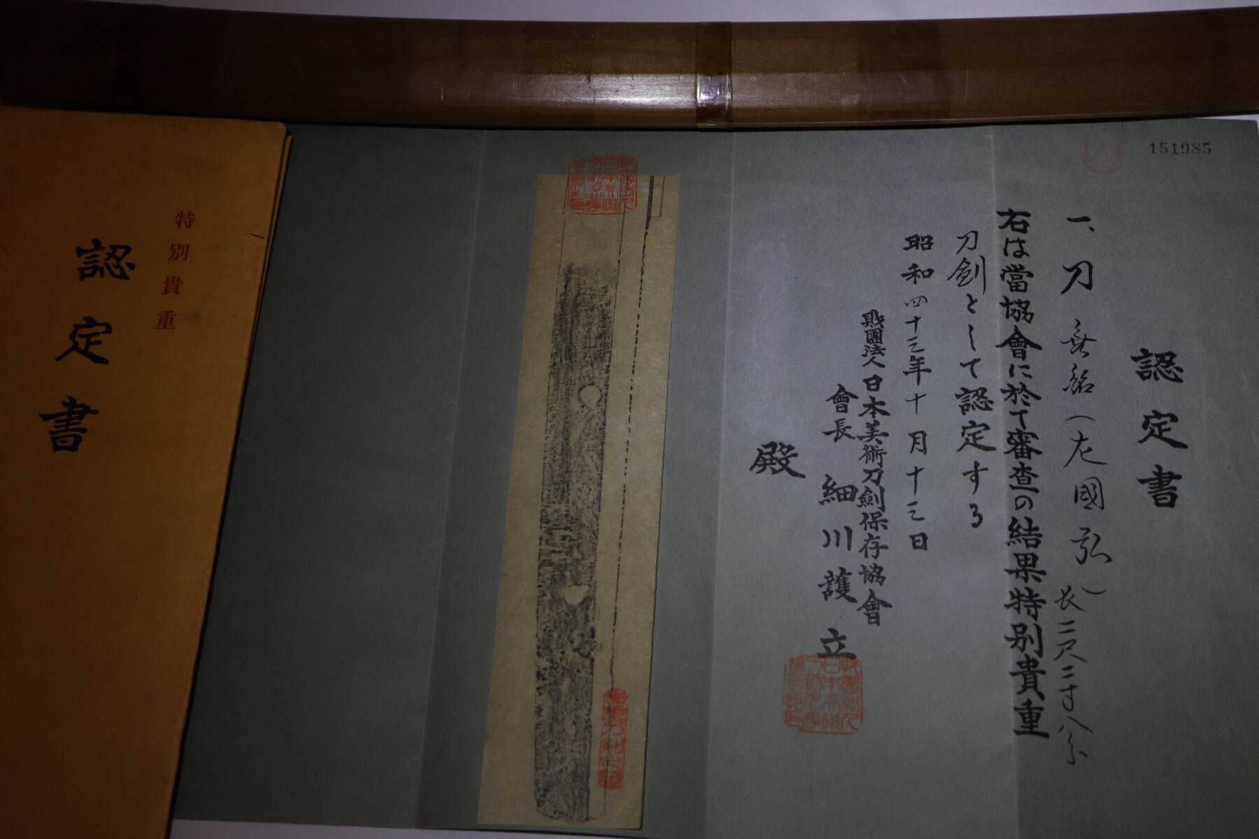 聖駕廣嶋大本営駐輦之砌明治廿七年極月 賜 上覧之栄而爾来翌年四月御通告 制間親□座右嘉賞為也 (unsure) <free translation> Emperor Meiji visited Hiroshima Imperial Headquarters in December 1894. We were honored to be inspected and later received a notification in the April of the next year, ……………………… for the award. 加藤友三郎誌 – Kato Tomosaburo wrote. Ref. Katō Tomosaburō - Wikipedia 左國弘 – Sa Kunihiro 寳永三年光忠折紙 – Hoei 3rd year (1706), Mitsutada origami 藝州浅野家伝来 – Hnded down through Asano family in Geishu 長壹尺壹寸壹分半 – Length, 1-shaku 1-sun 1.5-bu 昭和丁未年初冬 – Showa Hinoto-Hitsuji year (1967), early winter 寒山誌 – Kanzan wrote.6 points