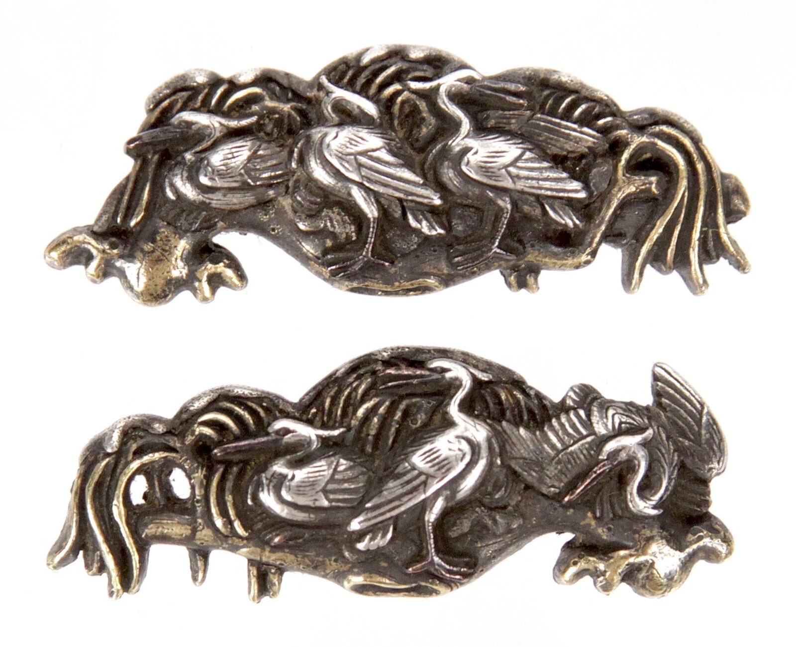 Hi guys, Could anyone find similar examples to the menuki below? It has silver back plate but the willow tree seems to have gold color, may be plated with gold. I tried to search online for similar examples but not seem to have any success. The design with egret and willow tree is very common in Japanese art and I have seem it often on kozukas and Tsubas. Based on the style I would say it is Goto school because I have seen one example from the 10th mainline master on a kozuka where four egret almost of the same design/gesture on a willow tree. However, I have since lost the link so not able to find it again. The closest example to it is the link below: https://collectorsfirearms.com/39515-kinko-menuki-mgj428.html/ but it has lower quality than the one I post. If anyone has something similar or can identify the possible school or maker I would appreciate it very much. My guess is a Goto school artist mid edo. BTW, I also wonder how gold is applied to silver base and why there aren't many silver based menuki around whereas shakudo and gold menuki seem to be more common. Thank you. Jack5 points