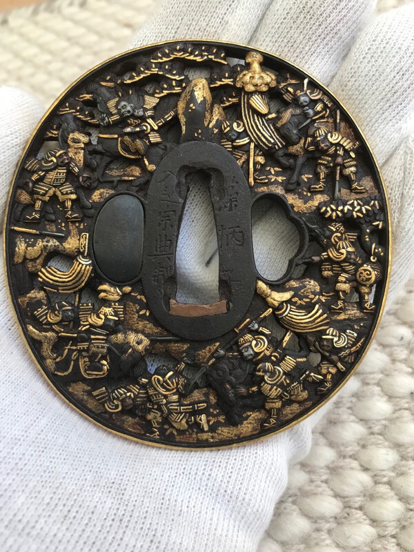 Goto Tokujo = my favorite mainline Goto dude. His son Kenjo is my #2 pick. Tokujo lead quite a life clashing with the Tokugawa, ending up ronin for a while, AND he did it with daughters En Tout. Elements of the Lone Wolf n Cub story from his life, and he was a top notch artist on top of it all. I saw this recently with someone who I thought was based in Japan. If you picked it up from him, well done. Scoring a complete set of Goto Tokujo work is.... very hard. I haven't been able to do it. I've been searching for one of his rare tsuba for several years and had one or two near misses.4 points