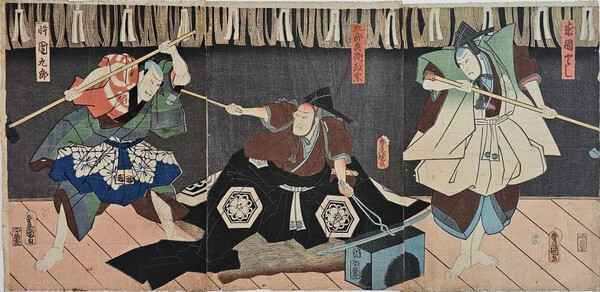 This one of my favourites - it shows actors Kataoka Nizaemon VIII as Rai Kunitoshi (Right), Ichikawa Danzô VI as Gorō Nyūdō Masamune (Centre) and Onoe Waichi II as his fictional son (Segare) Dankurô (Left). It is by Utagawa Kunisada (Toyokuni III) for the play Date Moyô Somete Kisaragi at the Nakamura Theatre in 1858.4 points