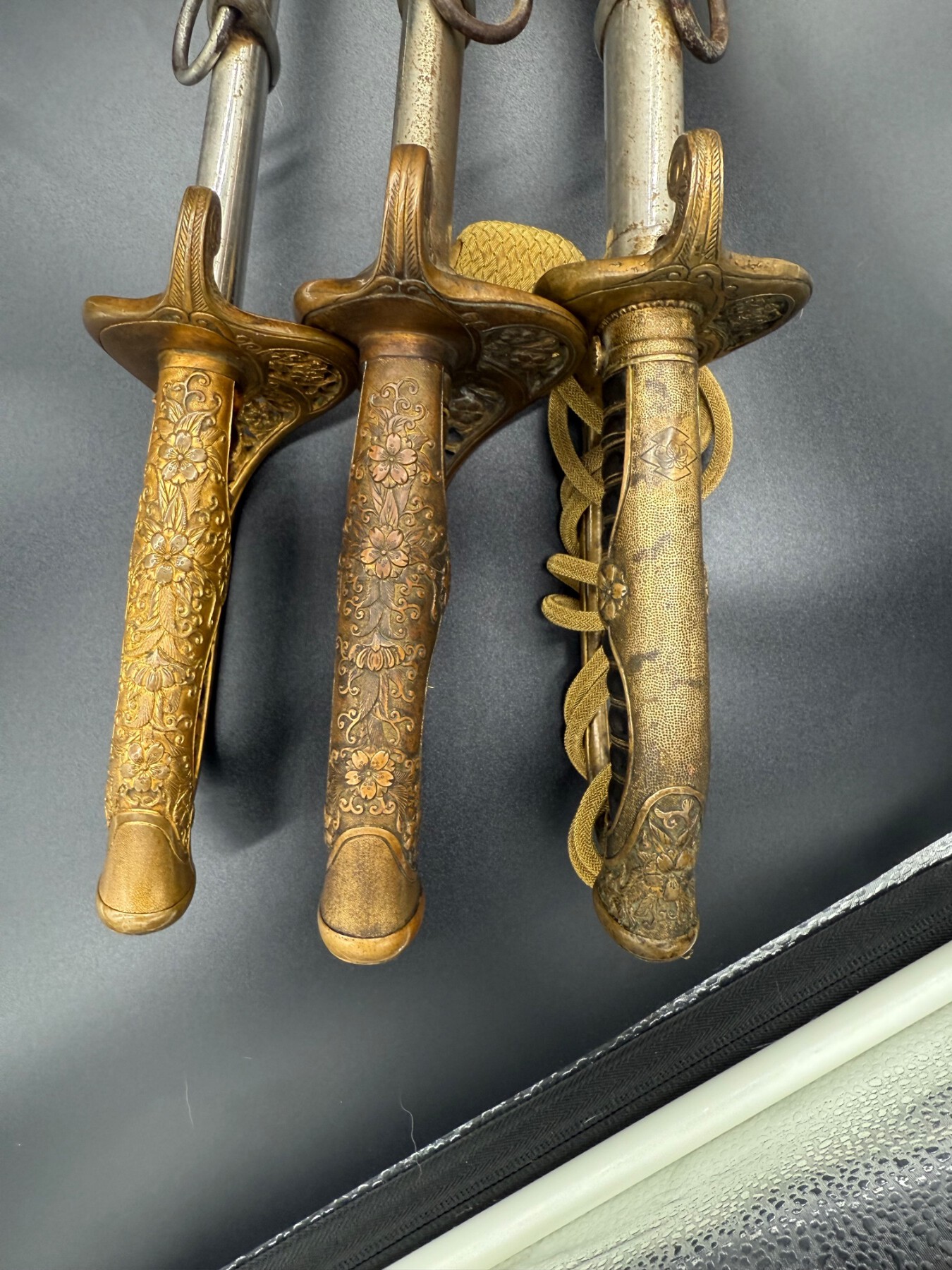Hi Markus, Your sword isn't a gunto (military sword). It is an older samurai sword. If I were in your position I would: 1. Whittle a new mekugi (menuki are the ornaments under the handle wrap; mekugi is a pin to hold the sword together) from a bamboo chopstick. The pin is incredibly important; don't delay. 2. Look for a collector/collectors' group that is strong on knowledge and honesty who can give you a better idea what you have. 3. If you are going to take other photos, use a dark background. Details will be more visible. Here you will find a care and handling brochure: https://nbthk-ab2.org/sword-characteristics/ You should read it. Best, Grey5 points