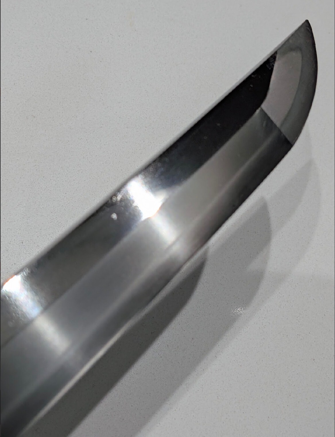 Dear Joseph. It is perfectly understandable that you are looking for the type of boshi but there is a problem. When you read the texts they seem to suggest that there are discreet types of boshi and even that they can lead you to a specific smith. This is sometimes true, the example that Chris gave of a Mishina boshi being a case in point. Mishina being the name of the school. In some swords you would certainly expect a specific boshi as confirmation of the smith however in many others this classification by type does not work. To quote from Markus in Shinto and Shinshinto Kantei, "....on the omote side a shallow notare komi with a pointed and rather long kaeri, on the ura side a more sugu based notare with some ko gunome which turns into a jizo like and short ko maru kaeri. there is hakikake on both sides." It is useful to think of the types displayed in text books as just that, text book examples. What they are giving you is a vocabulary with which to describe the features of the hamon in the kissaki. (The same thing can be said for almost any other feature of a sword.) With some swords the description might be short and sweet, something like suguha with komaru and short kaeri, sometimes not. From what I can see in your photographs your sword does not have a nice tight nioi guchi running into the kissaki and so the description might be more convoluted. Feel free to wax lyrical in your description of the boshi on your sword. I hope that helps rather than hinders. All the best.5 points