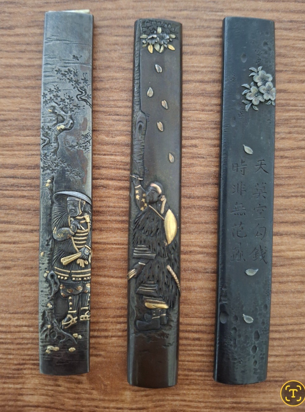Yes indeed Mauro. In fact it is my third kozuka with the same topic! ( from Internet: Lovely scene of the warrior Kojima Takanori kneeling beneath a cherry tree, having just written a poem on a tree's trunk. Takanori was a loyal supporter of the exiled Emperor Go-Daigo, and attempted to rescue him while he was being transported to a remote location. The samurai was able to sneak into the camp, but could not reach the emperor, so according to legend, he carved a poem of encouragement in Chinese for the emperor on a cherry tree. In the morning, the guards found the poem but could not read Chinese, but the emperor could, and was heartened by the message. A shower of delicate petals falls down over him in the cool evening breeze, and a full moon glows softly overheard.)4 points