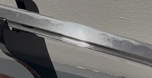 Very, very tired…. Signs are everywhere: weight, jigane (with all the forging lines visible all over the blade), hamachi narrowed down, hamon running off the edge in a few places. It must have been a very good blade once. Yet, zaimei ubu Ichimonji…. so it has historic and other value….5 points