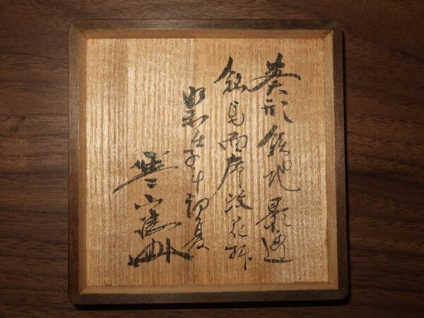 Here the hakogaki (I'm not shure about the date): 葵形鉄地影透 * aoi-gata tetsu-ji kage-sukashi 銘馬面序政花押 * mei Bamen Tsunemasa kaō 昭和壬子年弥生 * Shōwa mizunoe-ne-nen yayoi [March 1972] 寒山誌 * Kanzan shirusu (+kaō) Would you mind to post an image of both sides of the hakogaki? (I'm collecting images from hakogaki by Satō Kanzan)4 points