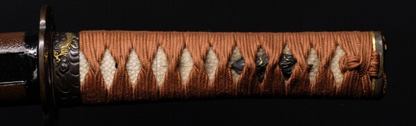 SOLD! MASAHIRO, SOSHU MEI: SOSHU JU MASAHIRO DATE: NONE NAGASA: 45.08cm (17.75") OVERALL: 57.15cm (22.5") MIHABA: 2.698cm (1.0625") KASANE: 0.63cm (0.25") SORI: 1.27cm (0.5") NAKAGO: UBU MEKUGI ANA: TWO YASURIME: KIRI MUNE: IORI HADA: KO-ITAME HAMON: O-MIDARE WITH TOBIYAKI BOSHI: KO-MARU WITH HAKIKAKE HABAKI: 2 PIECE GOLD FOIL KOSHIRAE This sword is signed Soshu Ju Masahiro. I want to state clearly, the majority of swords signed Masahiro are gimei. On such a big name it is always wise to assume gimei when there are no papers to authenticate the mei. While the mei is undoubtedly false, which was common throughout history, the sword is guaranteed to be a genuine Nihonto. The blade is in relatively poor polish with a couple of small ware but no serious flaws. The hada is tight ko-itame with some masame. There is considerable activity to be seen (see photos). The koshirae is in poor to fair condition. The kurigata, kaerizuno, are intact. The aragawara is missing. The saya is a brown lacquer with some damage and losses, again see photos. The Fuchi / Kashira are a copper base with eggplant and foliage done in mixed metals of shakudo and gold wash. I have no idea what the menuki depict, but they are brass. Tsuba is iron with what I am calling a stylized amida rays. The Kozuka is done in gold utori and depicts a horse and spider web on the shakudo nanako jita. The Kogatana is signed Jiro Taro Naokatsu, but is likely gimei as well. This sword is being sold under the assumption that all signatures are gimei. Nonetheless it is a genuine Nihonto with no fatal flaws, and may be perfect for the budget constrained. $450 PLUS S/H and any associated fees (PP, Wire, etc.) At this price sale is final.