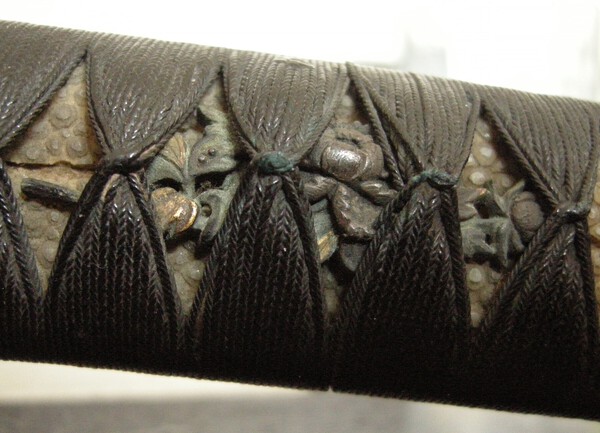 Thanks for the replies, I was thinking early Shinto myself.. Adam, that's interesting that you mentioned the Ito because along the the engraving, that was the other reason why I bid, It's outstanding work in my opinion which also drew me in. Hardware is/was silver plated so clearly a rather expensive setup back in the day. Tusba is carved and original to it but again, just my opinion based on fit and patina. Here's a photo of the Menuki, hard to say what flowers they are but they have gold highlights.. Kosuka definitely doesn't belong with this set up but I'm not complaining..