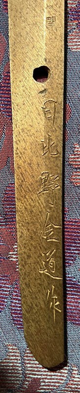 Hello Pip, looks an interesting sword. It is by Kinmichi (can also be read as Kanemichi) and he was a smith in WW2. Your signature (mei) reads his name "Hibino Kinmichi". KINMICHI (金道), real name Hibino Ichiji (日比野一二), born May 6th Taisho 6 (1917), he worked as guntō smith and died August 20th 1945 age 28. He was a swordsmith in Gifu Prefecture, and registered as a Seki swordsmith in Showa 17 (1942) September 10. He came from Kamo-gun district to the east of Seki, and Oyama in Tomida-mura (village). It is interesting when he died, as Japan officially surrendered on 15 August 1945 (in some cases there is a relationship). The mounts are not military but civilian ("samurai style") but looks like the kashira (pommel) has come off the tsuka (hilt)? a bit hard to see in photo. The mei looks quite well cut . Do you see any stamps on the hilt? Here is another example of his work. (Stein JSI) At right another example, signed "Kinmichi" and has a date when made, looks to be September, 1943 (Showa 18) (from Meirin Sangyo)