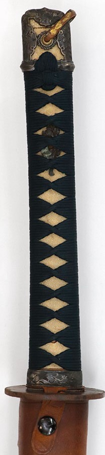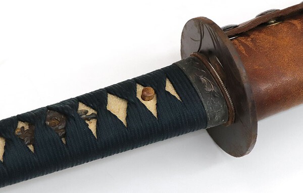 @Slaborde Sara, pic of sword (but still does not show kashira) and looks to me like its mounted for civilian working for Army. The detail of your tsuka shows menuki design of helmet/armour/tachi. The fuchi is not gunto. I wonder if gunto tsuba is added later and with spare seppa. The blade (and mounts) are similar to example #6,7, 8 posted above. But does not look would be carried by Army officer. Lets see other opinions.