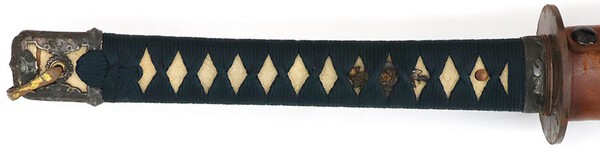 @Slaborde @Bruce Pennington Sara and Bruce thanks for kashira pic, as best as I can see it matches the fuchi (but poor pic of tsuka). So it is a complete bound tsuka with fuchi-kashira and menuki. However, I dont think the shingunto tsuba is original. It has an offset hole for spring clip as with shingunto, but seppa are not matched and no hole. Such a koshirae more likely to have plain iron tsuba with bigger hole for leather strap (like example 6-7-8).