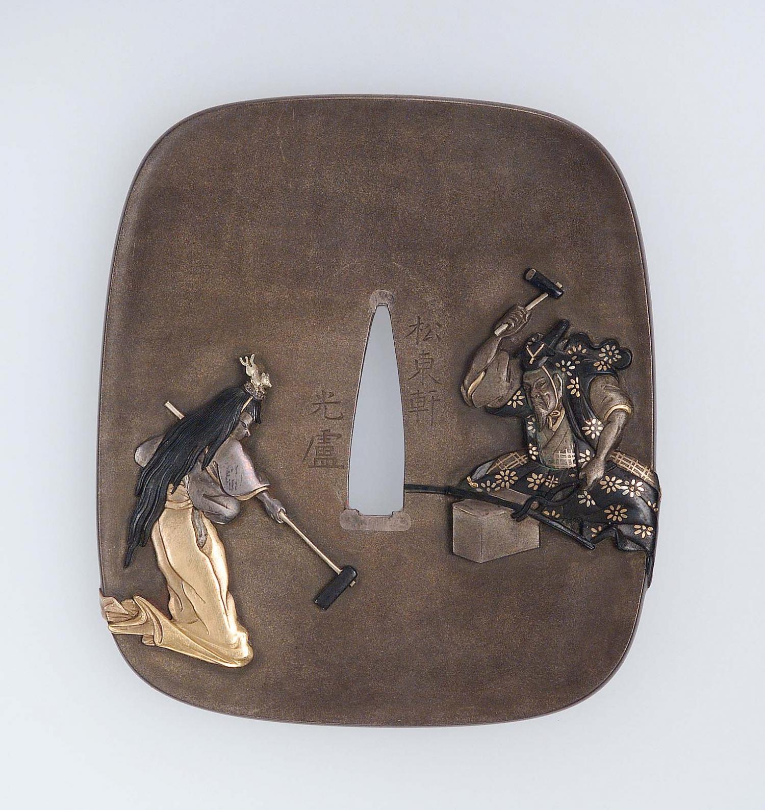 Nope, it's pretty rough. The leaves lack any real attempt at shaping or detail - they appear to be mere triangles inlaid into the ground, an inlay practice exercise at best. The crane is very coarsely executed, the background texture is sloppily applied and all of the structural elements are completely "off". The shape of the tsuba appears to be "top heavy" even when viewed from directly in front - imagine how it would look when viewed from an upward oblique angle, as it would when worn on a sword. I can't imagine this being let out of an Edo-period metalworking studio, at least one that catered to serious paying clients. In this case, the MOP is only a curiosity, not a design element of any major consideration.