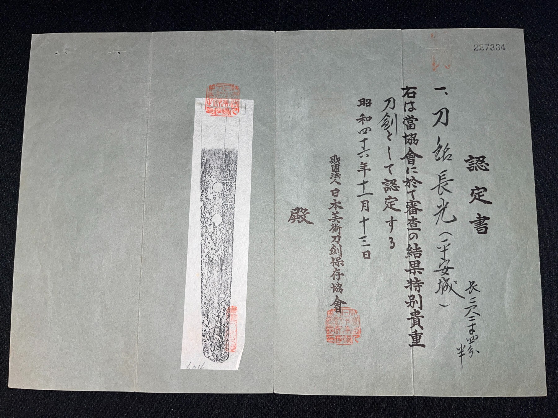 A fine papered 16th Century Katana by (Heianjo) Nagamitsu. This Koto period sword would make an important addition to any collection. This katana is in excellent polish. It is accompanied by beautiful mounts. The fuchi and kurikata have a matching gold floral motif. The kashira is polished horn. The tsuba is very interesting–it is made of lacquered wood. The plugs in the hitsu-ana are fine textured gold. A complementing silk sageo is threaded through the kurikata. A wood tsunagi (with habaki) was made for the mounts. The blade is in a handsome shirasaya. The shirasaya is wrapped with bamboo accents. The blade measures 68 cm (26.8 in). The 2-piece habaki is wrapped in gold foil. This Koto period sword is accompanied by NBTHK Tokubetsu Kicho papers. CONDITION: The blade is in excellent polish. The hamon and boshi are healthy. The koshirae is in exceptional condition. $6650 View additional photos by visiting http://StCroixBlades.com --Matthew Brice