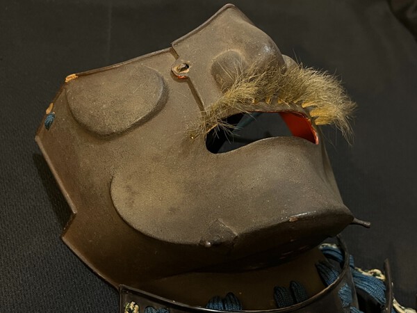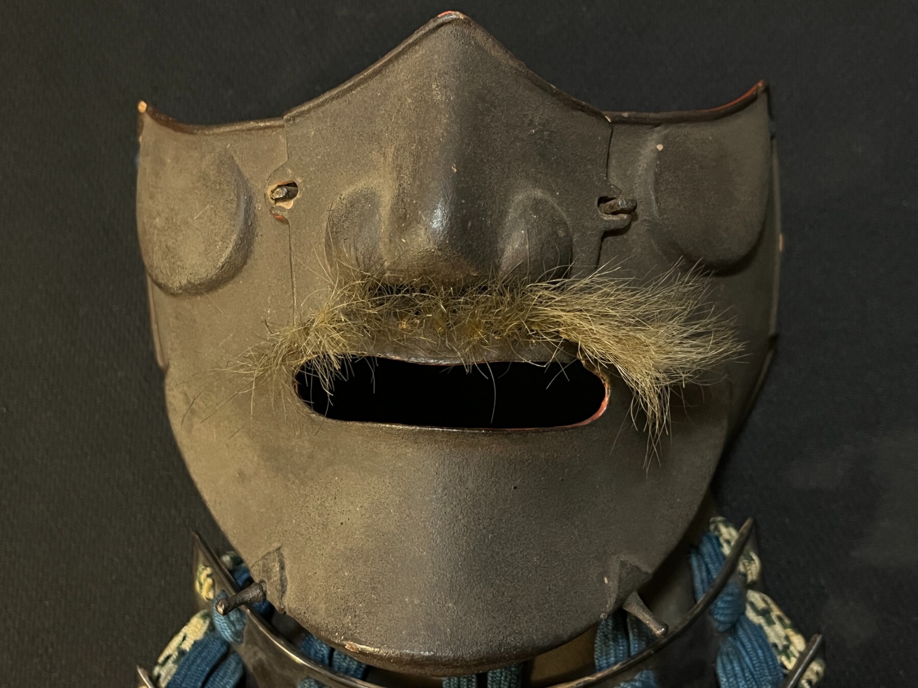 This menpo has a mustache, and cherry blossom chin vent. The inside of the mask is in red lacquer. CONDITION: This antique Menpo is in excellent condition. The silk lacing is in excellent condition. This is a fine piece. $1850 https://stcroixblades.com/product/antique-Japanese-samurai-menpo-armor-mempo-mask-old-sword-collection/ --Matthew Brice St. Croix Blades