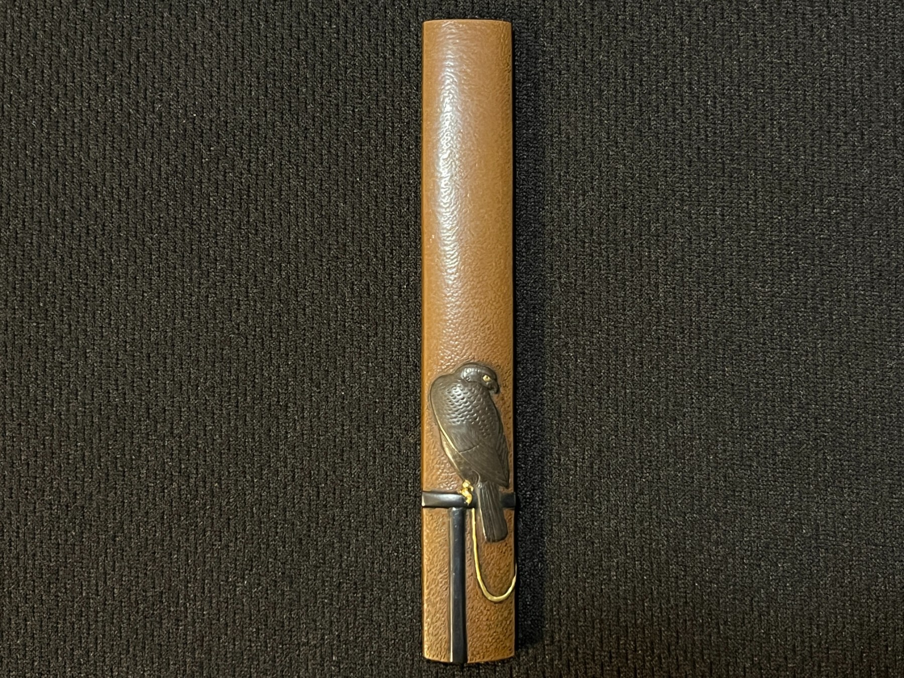 This beautiful kozuka depicts a hawk or falcon. This kozuka is signed. This kozuka has shakudo and gold work. This fine kozuka measures 3 15/16″ (9.9 cm) by just over 9/16″ wide (1.4 cm). CONDITION: This fine antique Japanese kozuka is in beautiful condition. $800 plus shipping (and Paypal/credit card if choosing to pay that way) --Matthew Brice St. Croix Blades