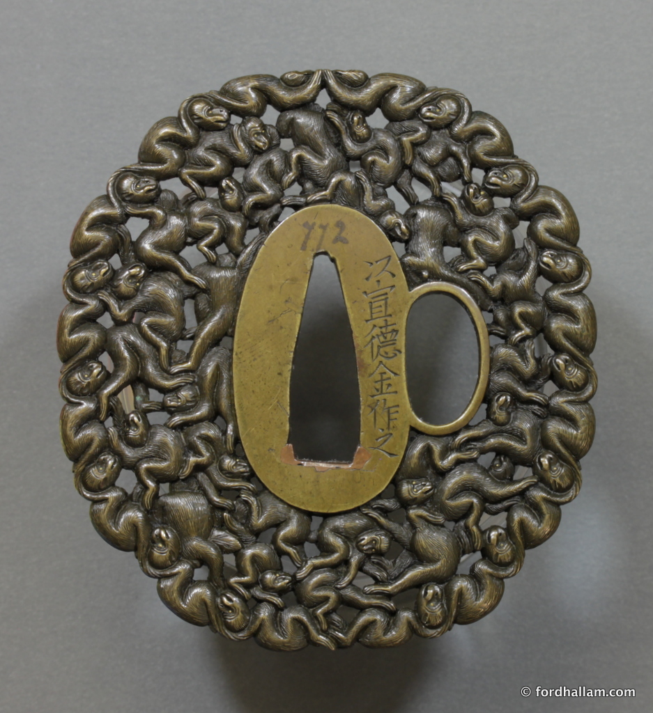 10. No, I don't have a warehouse full of typewriters and fancy having a go at rewriting all of Shakespeare I'm looking for some more of these, specifically tsuba signed Mitsuhiro ( either or both generations) and baring an inscription identifying the metal as sentoku/sentokudo/kin as in this example. As some of you may know I've been immersed for some time now in researching the origins and compositions of traditional Japanese metals and alloys. One area I'm presently tidying up in my survey is that of brass/shinchu and brass/bronze type alloys, specifically sentoku. Sentoku was quite popular among bronze casters in the Meiji period but the only tsuba maker (no other tosogu I'm aware of) who can be pointed to as at least claiming to have used it would be Mitsuhiro, he of the 100 monkeys (and horses ) fame. I've got one fine example here and have had it analysed, non-destructively, and found the results intriguing... There's a possibility of some connection with the original 15th century Xuān dé bronzes that the Japanese version is said to be emulating. That's a separate area of investigation I've already explored. I'm doing a series of analyses at the V&A archive in London on the 14th March and will be examining their Mitsuhiro monkey tsuba. So I'm looking for some more examples to add to this mini-study to see what the data suggests. The testing is non destructive. If you're in the UK, or maybe even the EU, and have a suitable example you'd be willing to lend me for a couple of days I'd be grateful to hear from you. Thanks for your interest. Ford Hallam