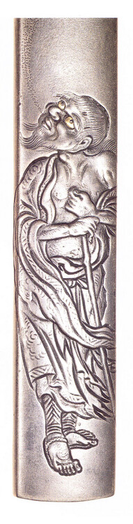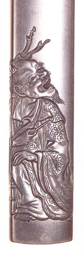 Hi Colin, Kano Natsuo (1828-1898) is considered my many connoisseurs to be one of the, if not the, finest artists in the kinko tradition. He seems to have been a good businessman and ran a very productive studio. Many of his assistants/students went on to become celebrated Meiji period artists in their own rights. Natsuo was appointed "Teishitsugigeiin" to the Emperor's court, this was the sort of position that would eventually be better known as "Ningen Kokuho", the holder of an Important Intangible Cultural Asset. His workmanship, from a technical point of view, is always flawless and incredibly sensitive and delicate. He had a very refined, elegant and understated aesthetic which for many epitomises the highly cultured court life of the Heian period. I've seen a few kozuka by him but I suppose they are a bit of a rarity. The inscription is in a clerical script that evokes a strong antique feeling, and would have done so even when it was new. I'd suggest that the quality of the piece lies as much with the actual carving of the kanji as with the calligraphy. What I mean is, this would be a fine piece of calligraphy even if it was "merely" painted on paper....all the more impressive that it's carved, so perfectly, in steel. It's very easy to overlook much of the real beauty of work like this, particularly when only viewing a photo, but there is a great deal more here than first meets the eye. It's this sort of subtle and sophisticated chisel work, almost regarded in an abstract way, that is most highly prized by the Japanese connoisseur, whereas in the West the most commonly appreciated aspect is the subject matter. Hope that sheds a little light on the matter, regards, Ford p.s. If you'd like to study another genuine example here's one of his classic tsuba with carp. Once you run your cursor over the downloaded image you'll get a much bigger image to see. It's worth looking closely at the rim. Note how sensitively he has worked it and how organic and natural it seems...it defies the actual material in a way.