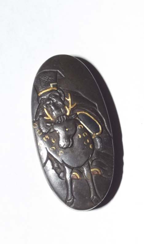 Hello, I recently picked up some fittings and thought I'd share and see if anyone had any thoughts, first is a kozuka, maybe Hamano school? No idea if it could be attributed to a specific maker as it's unsigned. it came with a kashira that looks like it was part of a set (sadly no fuchi, but I just looked at the kashira as an extra, and the slim-slim-slim chance might I come across a suitable fuchi some day) I'm familiar with the deer and sage theme but I couldn't find/remember what the sages name was? I also have a tsuba, octagon shaped with multi metal inlays of anchors and plovers, one of the openings for the kozuka/kogai is squared off, like I've seen on some Higo guards? Grateful for any input as to age and school if possible. Also wanted to mention I might sell these at some time in the future (not any time soon but I figured I should mention it as they could end up on ebay months or years from now) Thanks in advance for your time, Lance edited to add kashira picture