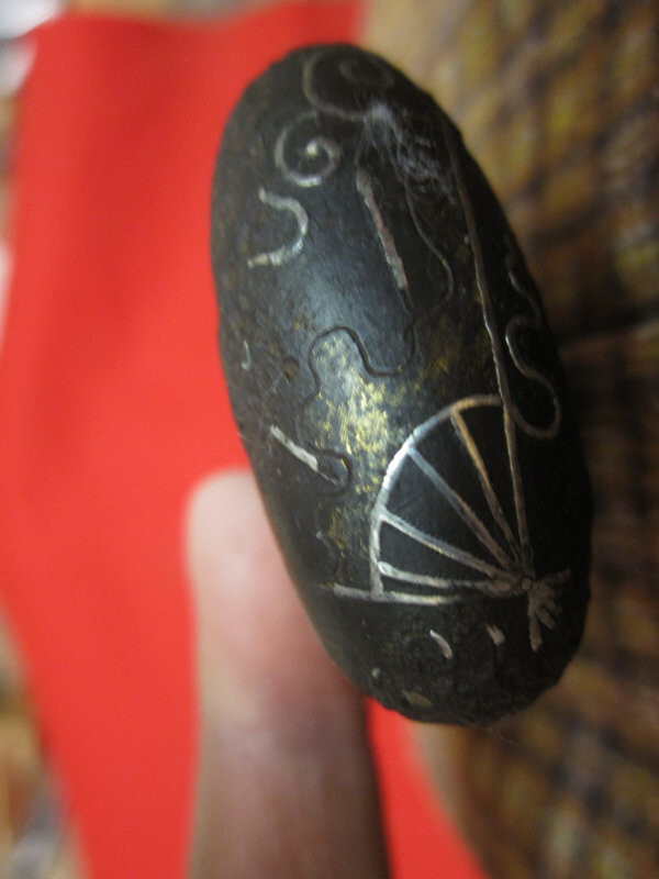 Dear Sirs I know nothing about care or cleaning of mountings.Could someone please enlighten me? My wife won this on e-bay over Christmas for me and while greatful, it has a long way to go to be pretty!The mounts are Iron,very rusted,and silver inlay with some gold figures?Could someone tell me what the theme is?I do need to purchase some mennuki and I would like to keep with the same theme.How would the Iron mountings be attached to the Tsuka and saya?Lastly, the blade seems pretty thick,could this be an armor piercing tanto? Thank you sirs for your response: Joseph C.