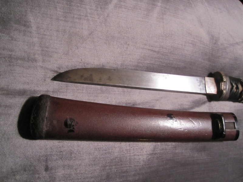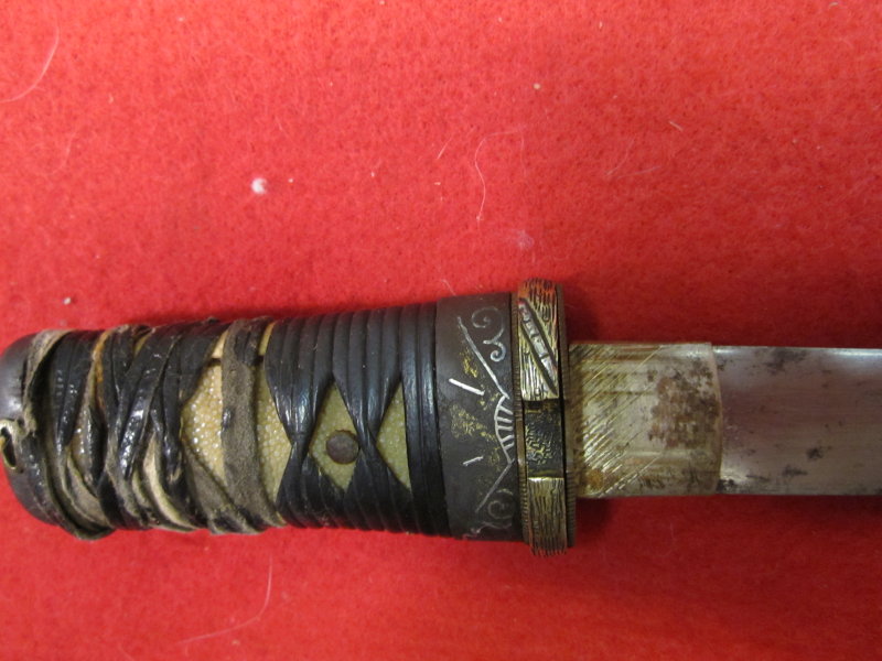 Thank you David The handle and wrap are of no big deal,I just need to decide on and find some mennuki.The habaki is silver plated with a rain pattern,and needs to be replated,or a new one made. Of coarse the blade needs a polish.I like the fittings,although I dont know how to clean the rust off the gold layers--plating--without damaging it.I read once that a bone pick is used to clean Tsuba,and that oil and "worrying" it with a felt cloth will turn the rust into something like a chokolate brown color.Under a magnifier,the gold looks to have a "growth of rust in places.Is there some sort of cleaning agent?Anyway,Here is some pictures of the blade in mountings.The blade does have a pretty hamon,and there is only one tiny nick in the Ha.There does appear to have some kind of forging pattern but cant tell due to the state of the polish.Anyway,thankyou for your reply. Best Regards Joseph C