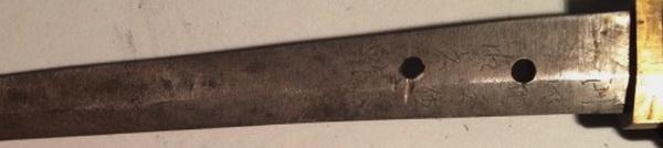 Good mornin to all and thank you all for your insights / opinions Vajo (Chris) thank for your efforts, I O Hiragana maybe not correct, but at this point more than I had. However Chris is is not an old blade, workmanship is not that good, tang lacks patina, Mekugi anna is drilled. I believe this is a WWII period sword and am further that it was made in a arsenal of mill steel.There are no arsenal stamps on it, but as we know stamps were not used initially. maybe the sword was made before that time. one of the puzzles with this sword is why the mei first Kanji is so high on the tang that it is covered by the Habaki. As for Rokujuro's, (Jean's), I agree with most of your comments but do believe it is WWII era sword.I will post some additional photo's of the tang, Nakago in awhile. Please understand - the sword is not for sale I am not charging the young man for whatever I can learn. Just trying to help him find out what he has. Thank you all again, has been an interesting puzzle so far which is why I love following this group discussion. Hopefully we all learn. Take care, Charlie