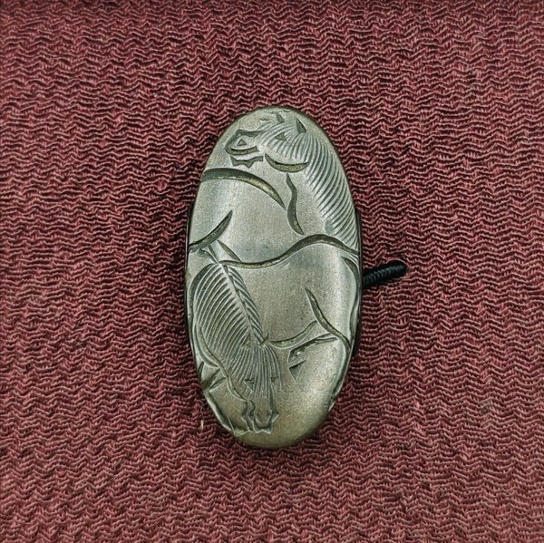 Set of fuchi-kashira in shibuichi with katakiri-bori engravins of horses, signed Furikawa Jochin + kao (古川常珍), with shakudo shitodome. It comes with Hozon certificate. Dimensions: Fuchi 36x20 mm Kashira 32.5x16.5 mm Price 600€ plus shipping From the book 刀装小道具講座: Furukawa Jochin (古川常珍) Biography and Background Jochin was the biological son of Moto-akira (元珍, also read as Moto-chin). His skill level was very similar to his predecessor, and he is considered to have been of equal talent. He resided in Bakuro-cho, Kanda, Edo (modern-day Tokyo), and was active during the An'ei to Kansei eras (roughly 1772–1801). Bakuro-cho was divided into three districts (chome); today, the name survives in Nihonbashi Bakuro-cho 1-chome through 4-chome in Chuo Ward. The name originated from the bakuro (horse dealers/handlers) who managed the horse grounds in the area. During Jochin’s time, it was a district known for having many hatagoya (travelers' inns). Inscriptions (Mei) The majority of his works are signed "Furukawa Jochin [Kao]" (古川常珍 followed by a stylized monogram). While he used a consistent style of Kao, subtle variations can be found. Placement: On most fuchi (collar), kozuka (small knife handle), and kogai (hairpin/skewer), the signature is typically located on the left side. Calligraphy: The brushwork style of the characters for "Furukawa" resembles that of Moto-akira. Materials and Techniques His style is highly reminiscent of Moto-akira. He frequently employed katakiri-bori (incised carving mimicking brushstrokes) on kozuka made of shibuichi (a copper-silver alloy). Relief Work: Compared to his father, fewer extant works feature takabori (high-relief carving). He also produced works using kin-moku (gold application/inlay). Base Metals: He primarily worked with shibuichi and shakudo (a copper-gold alloy). Works using nanako-ji (a "fish-roe" stippled background) are rare. Artistic Style: A defining characteristic of the Furukawa school is the frequent use of vertical compositions (tate-zu). Methodology: In addition to katakiri-bori and ke-bori (fine-line engraving), he utilized techniques such as: Katakiri-hira-zogan (flat inlay combined with incised lines) Takabori-iroe (high-relief carving with colored metal overlays) Usu-niku-bori (low-relief carving) School Influence: His carving style for details—such as the curly manes of shishi (lion-dogs)—shows the technical habits and influence of the Yokoya school of metalwork. Common Motifs (Designs) Jochin shared many of the same subjects as Moto-akira. The school is characterized by a fondness for figure carvings, including: Chinese Themes: Characters from The Romance of the Three Kingdoms, the Seven Sages of the Bamboo Grove, Hotei and Daikoku, Hotei with Chinese children (karako), Taoist Immortals (Sennin), and the Tiger Immortal. Japanese/Folklore Themes: Shuten-doji, monkey trainers, figures washing sweet potatoes (imo-arai), figures with rice-cake hoops (mochi-wa), Manzai dancers, scenes from the Soga Monogatari, doll makers, Ohara-me (flower sellers from Ohara), figures pasting posters, children climbing trees, the Kuya Nenbutsu (monk Kuya), ferry boats, moon-viewing scenes, and young cowherds. Animals/Mythical Creatures: Shishi lions, tigers, Kirin (qilin) and Phoenixes, and herds of horses.