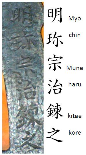 Hi everybody, I'm unable to fully understand a mei in ura side of a badly damaged tsuba: The transcription should be: 明珎宗治錬之 but the last sign could be the hiragana え (as verbal inflection for "forged"). I grasp the meaning (Myōchin Munearu forged this) but I'd like to know the exact transcription in romanji. A similar signature on a tsuba from Boston Museum of Fine Arts was reported as "Myochin Muneharu kore o kitaeru" (?). Thanks for reading. Mauro