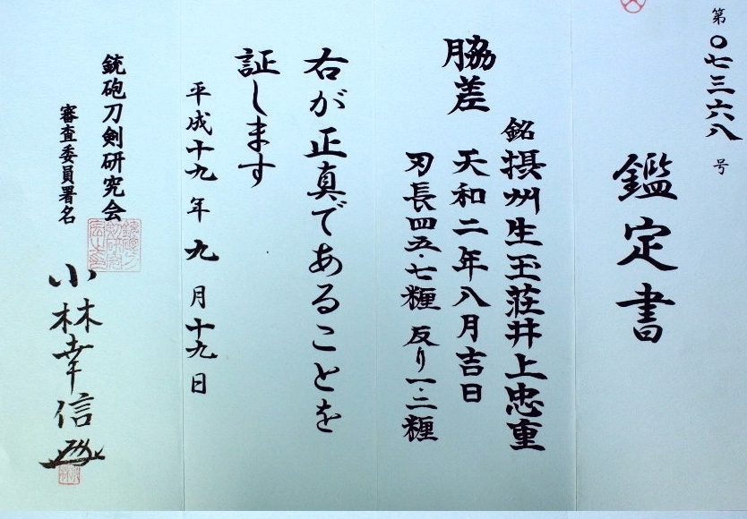 Dear All, I have a nice Kanbun shinto wakizashi which has some weird origami attached to it. I know from the seller that the origami attributes this sword to Tadashige (Fujiwara Tadashige, Settsu - as some Forum member explained "He was a pupil of shodai Tadayuki, and he also produced in Edo". The signature on the sword is - not that I can read it - SESSHU IKUTAMA NO SHÔ INOUE FUJIWARA TADASHIGE My questions are: 1. who has issued the origami? 2. Is it a known organisation or dealer? 3. What do the papers say if (if they say anything more than I already know)? Thank you for your kind assistance, I am obliged :-) Oh, and for the curious - here are some pics of the sword as well :-)