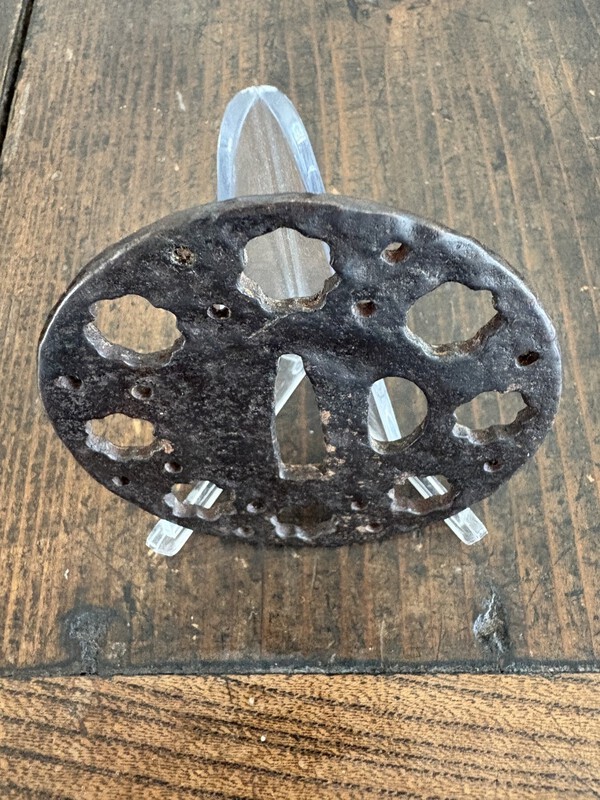 Finally, a tsuba I had offered some time ago, and am now re-offering at a significantly reduced rate. The form and motif elements of this piece usually result in an attribution to (ko-)katchushi, with the larger motif elements identified as stylized snowflakes. This tsuba features a strongly-hammered plate and a nakago-ana indicative of the guard being fitted to a fairly broad blade, measuring at 3.1 cm. The tsuba itself is a good size: 8.1 cm x 2.5mm. I would locate this sword guard in the early-Edo Period. $100.00, plus shipping.