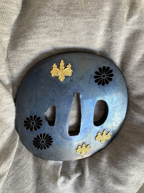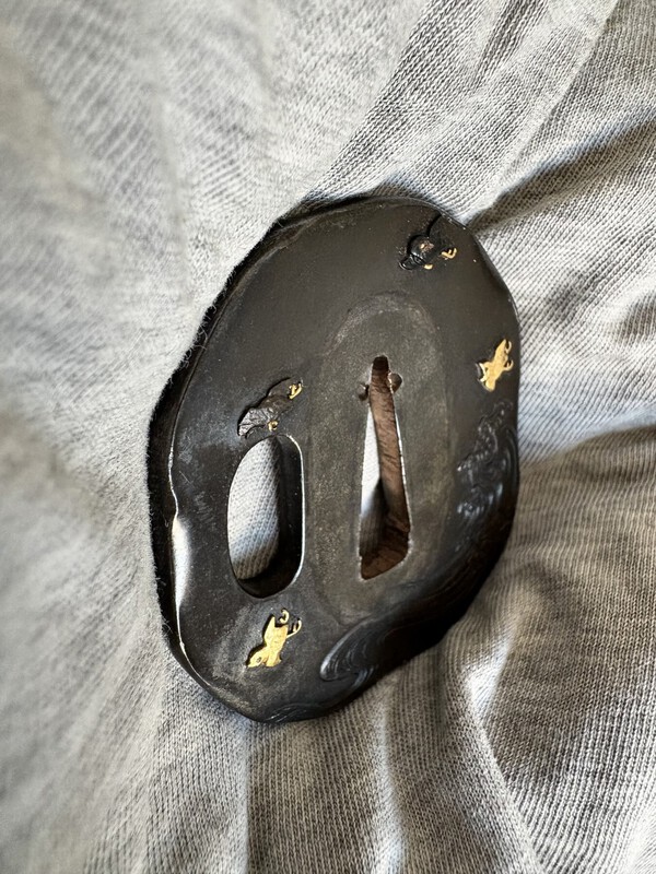 This is a small (5.5 cm x 4.8 cm x 3mm) irregularly-shaped kinko tsuba with a pleasing motif of plovers over waves. I believe the material is yamagane, with gold accents applied to various degrees in the plovers. The rim is gently upturned here and there, suggesting of some Umetada and Kaneie rim treatments, though this piece is, of course not of those traditions. Seppazuri is strongly present on both sides of the tsuba. The sword guard presents with deep color and is in very good condition. $140.00 plus shipping.